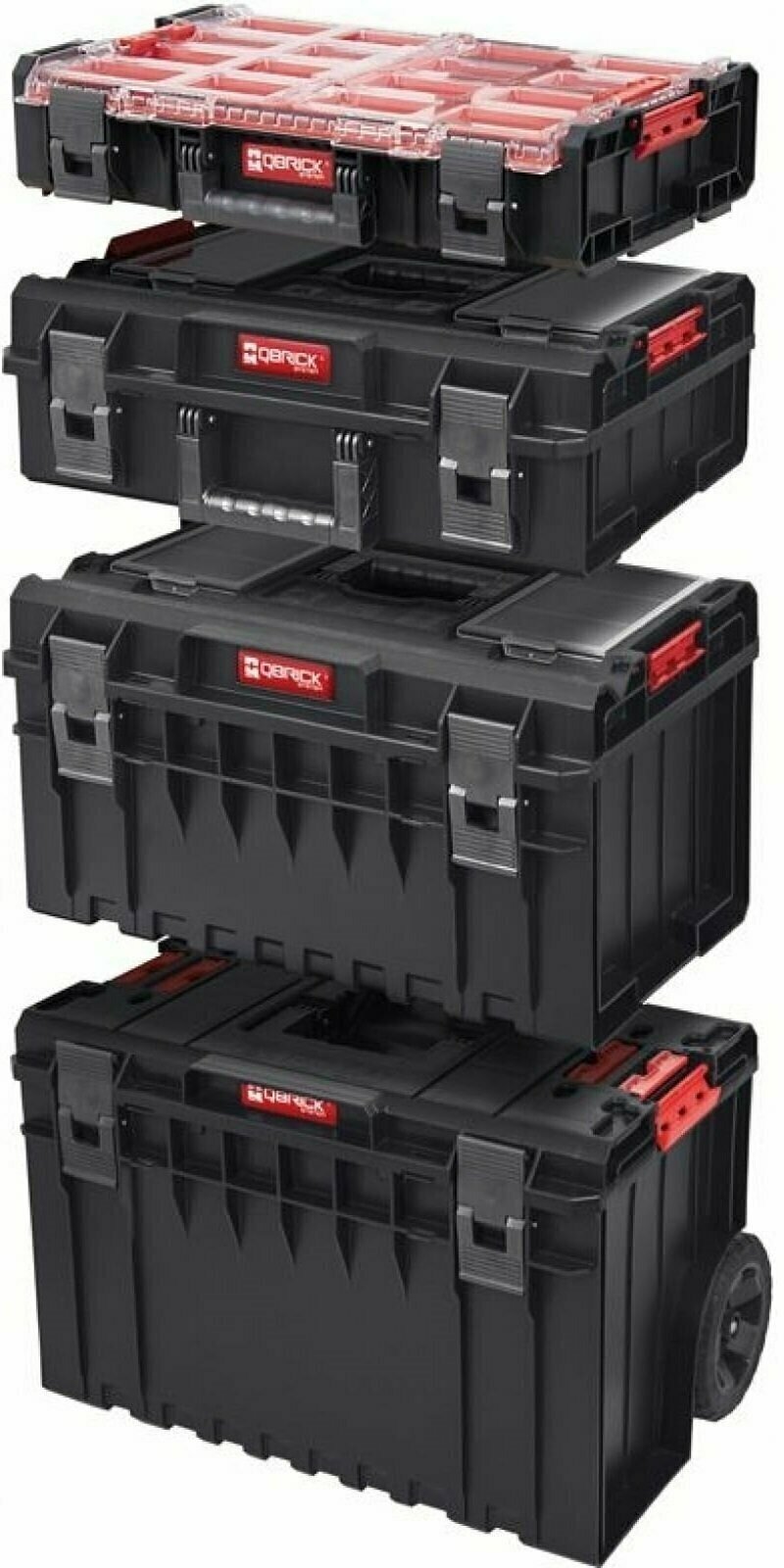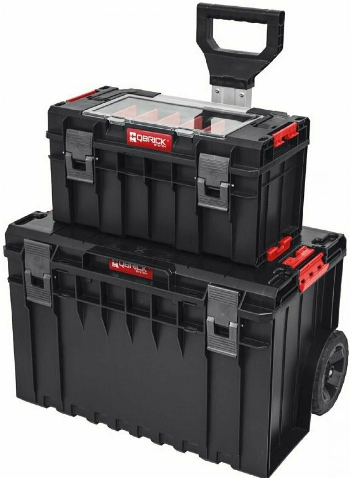 Ящик для инструмента QBRICK System One Cart 600x460x765 мм оснащен двумя колесами для мобильности модульных систем Qbrick. Колеса с резиновым покрытием, крепятся на металлической оси, что позволяет безопасно транспортировать большие наборы. Телескопическая ручка отклоняется при открытии крышки для удобного доступа к внутренней части ящика. Ящик гарантирует полную защиту от попадания пыли и воды. Усиленная конструкция крышки и корпуса гарантирует большую грузоподъёмность 50 кг и выдерживает нагрузку до 120 кг, что дает возможность создавать удобные рабочие платформы.. Доплнительно крышка оснащенная алюминиевыми рельсами, которые позволяют фиксировать столярные зажимы для распила и обработки различных материалов. Ящики можно свободно комбинировать друг с другом в конфигурации модульной системы One .