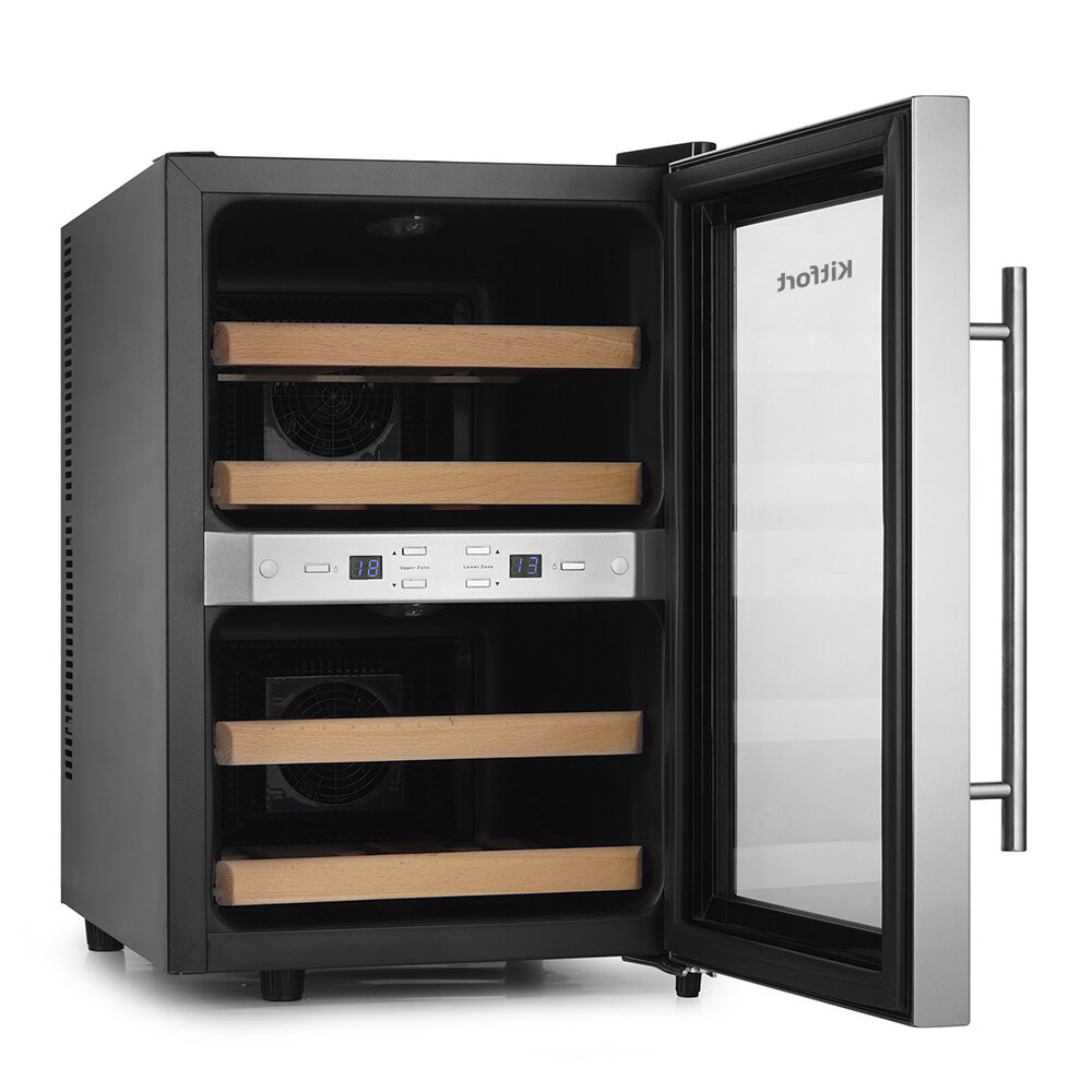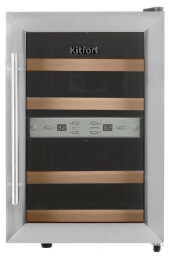 Винный шкаф Kitfort состоит из двух камер, в каждой из которых возможно выставить индивидуальный температурный режим хранения. В винном шкафу имеются двенадцать лотков для укладки бутылок, по шесть в каждой камере.