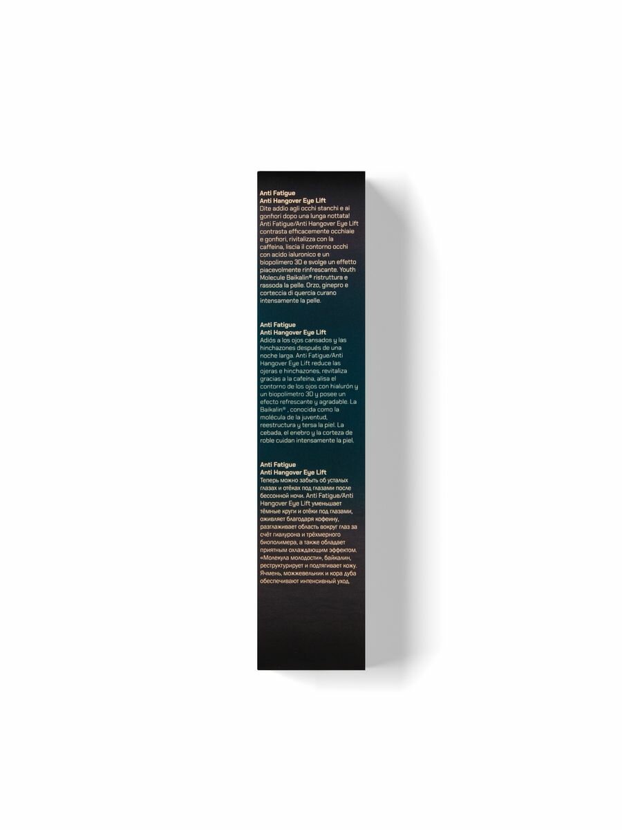 Ночь была долгой, и наутро глаза выглядят уставшими и отекшими? Пора с этим покончить! Anti Hangover Eye Lift борется с темными кругами и отечностью. Натуральный кофеин из гуараны тонизирует кожу вокруг глаз и придает ей свежесть. Гиалуроновая кислота и 3D биополимер разглаживают кожу, а соединение ментола и молочной кислоты дает приятный охлаждающий эффект. Молекула молодости Байкалин® реструктурирует и тонизирует кожу. Экстракты ячменя, можжевельника и дубовой коры улучшают состояние и внешний вид кожи.