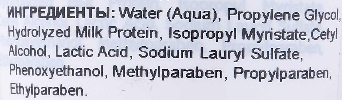 Состав: water (aqua), propylene glycol, hydrolyzed milk protein, isopropyl myristate, cetyl alcohol, lactic acid, sodium lauryl sulfate, phenoxyethanol, methylparaben, propylparaben, ethylparaben