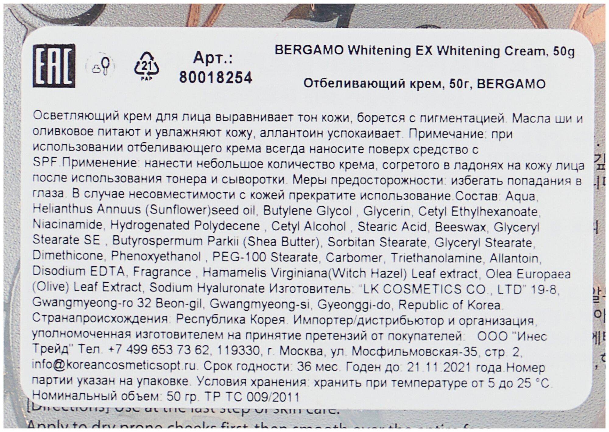 - Отбеливающий крем Bergamo Moselle Whitening Ex Whitening Cream 50мл