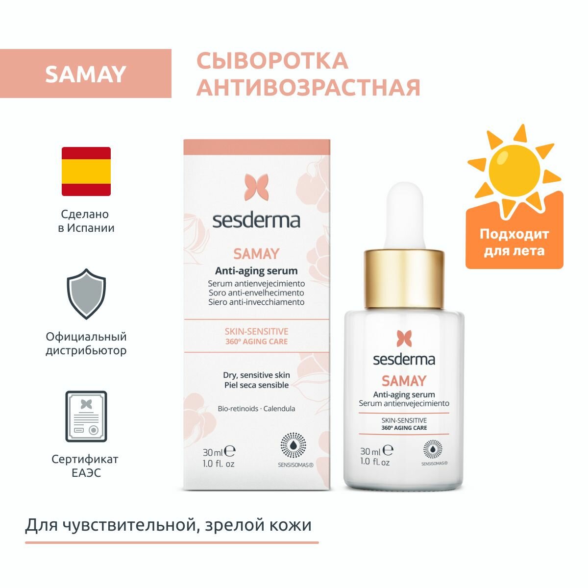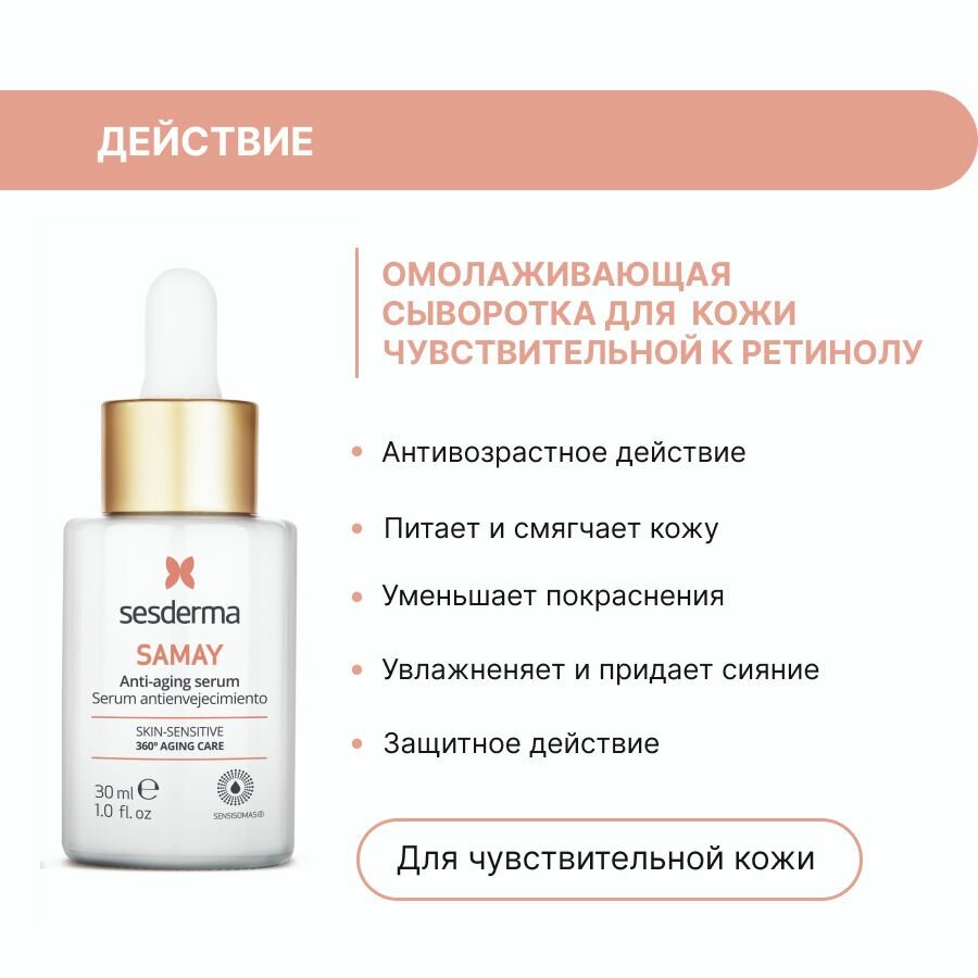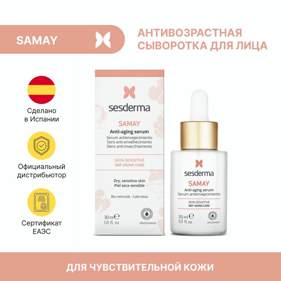 Сыворотка антивозрастная SAMAY специально разработана для чувствительной кожи и кожи склонной к раздражению. В дополнение к омолаживающему действию активные вещества восстанавливают защитный барьер, увлажняют и успокаивают кожу. Уникальная формула заключена в микроскопические капсулы Sensisomas®, которые улучшают проникновение активных ингредиентов без раздражения чувствительной кожи.