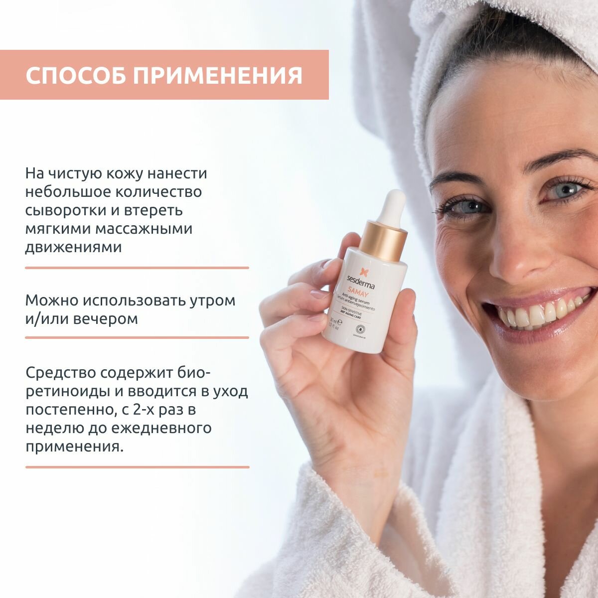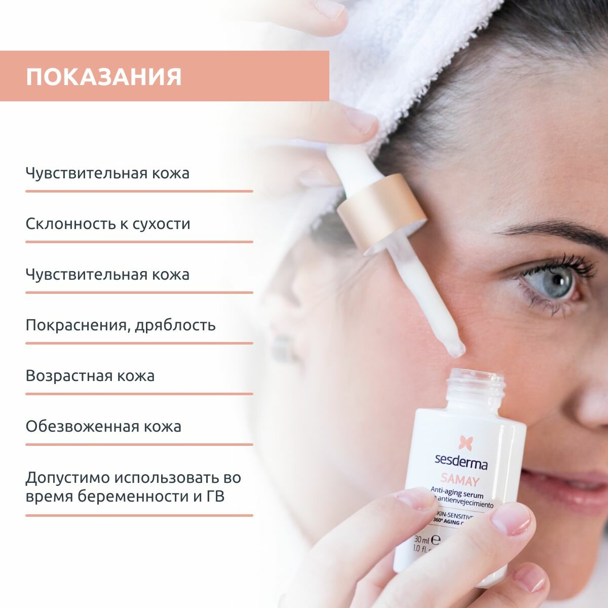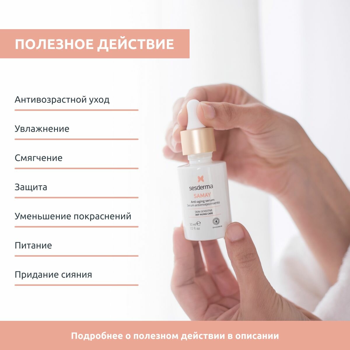 Сыворотка антивозрастная SAMAY специально разработана для чувствительной кожи и кожи склонной к раздражению. В дополнение к омолаживающему действию активные вещества восстанавливают защитный барьер, увлажняют и успокаивают кожу. Уникальная формула заключена в микроскопические капсулы Sensisomas®, которые улучшают проникновение активных ингредиентов без раздражения чувствительной кожи.