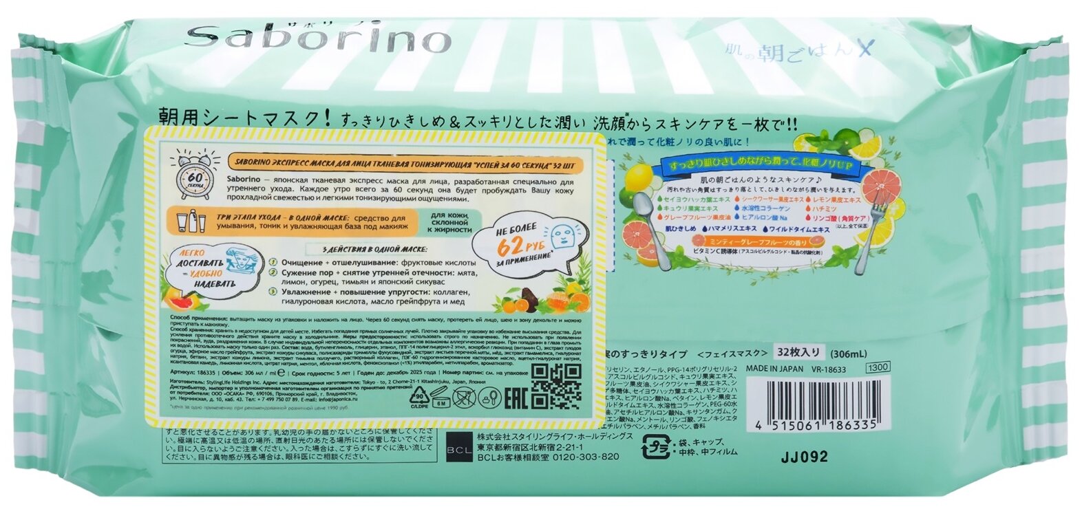 SABORINO Экспресс маска для лица тканевая тонизирующая "Успей за 60 секунд" 32 шт (SABORINO ) (186335)