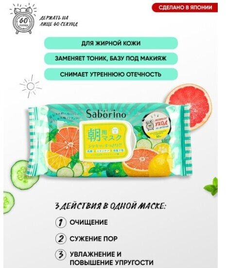 Saborino - японская тканевая экспресс маска для лица, разработанная специально для утреннего ухода. Каждое утро всего за 60 секунд она будет пробуждать Вашу кожу прохладной свежестью и легкими тонизирующими покалывающими ощущениями. Три этапа ухода - в одной маске: средство для умывания, тоник и увлажняющая база под макияж. Для кожи склонной к жирности.