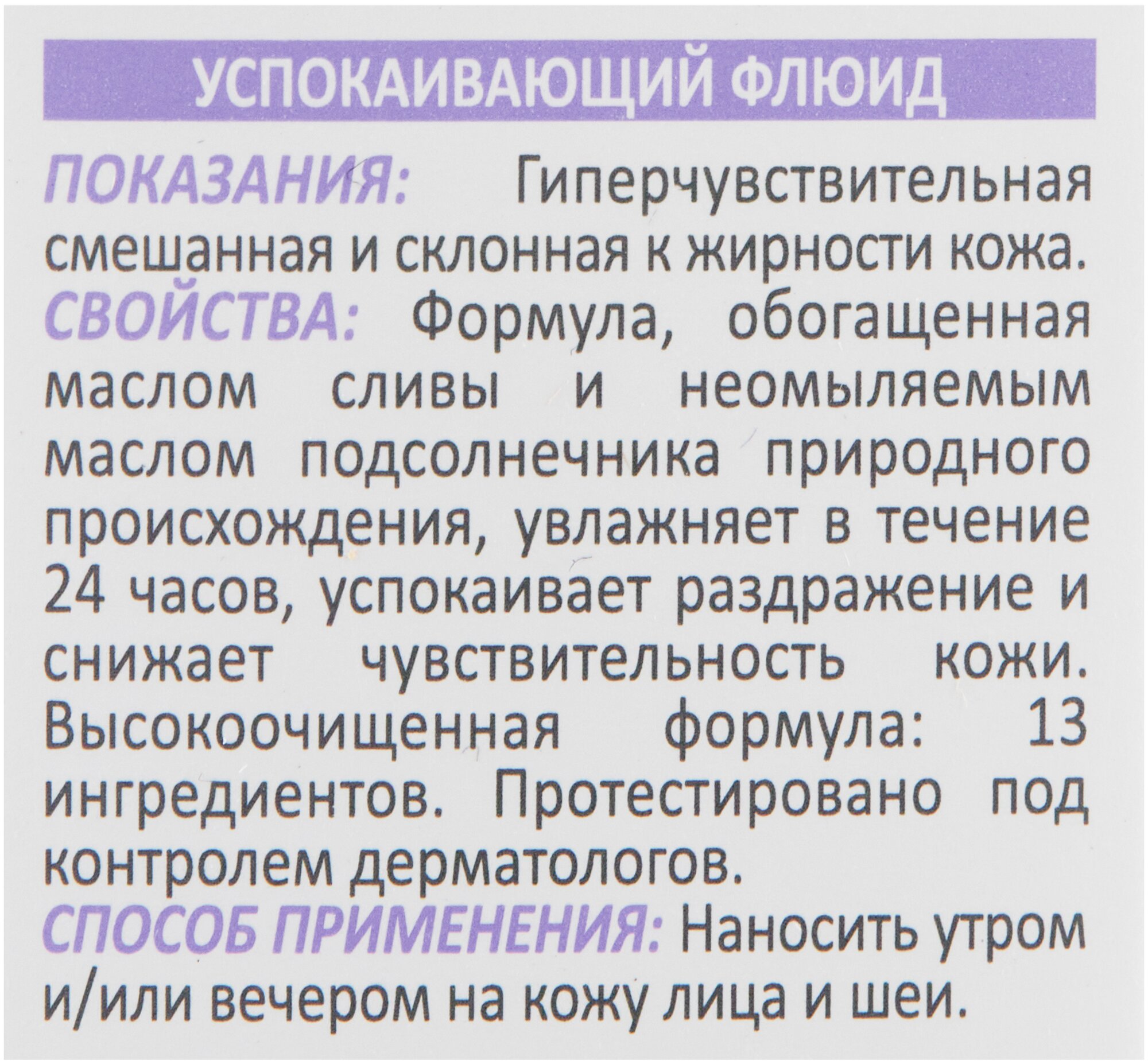 | Полное описание | Успокаивающий флюид с высокой переносимостью специально разработан для увлажнения и смягчения очень чувствительной кожи. Успокаивает покраснения, устраняет неприятные ощущения покалывания и стягивания. Увлажняет кожу и укрепляет кожный барьер, питает и смягчает. Результат применения: уменьшение интенсивности покалываний и дискомфорта кожи увлажненная, спокойная, мягкая кожа Протестировано под контролем дерматологов на чувствительной коже. |