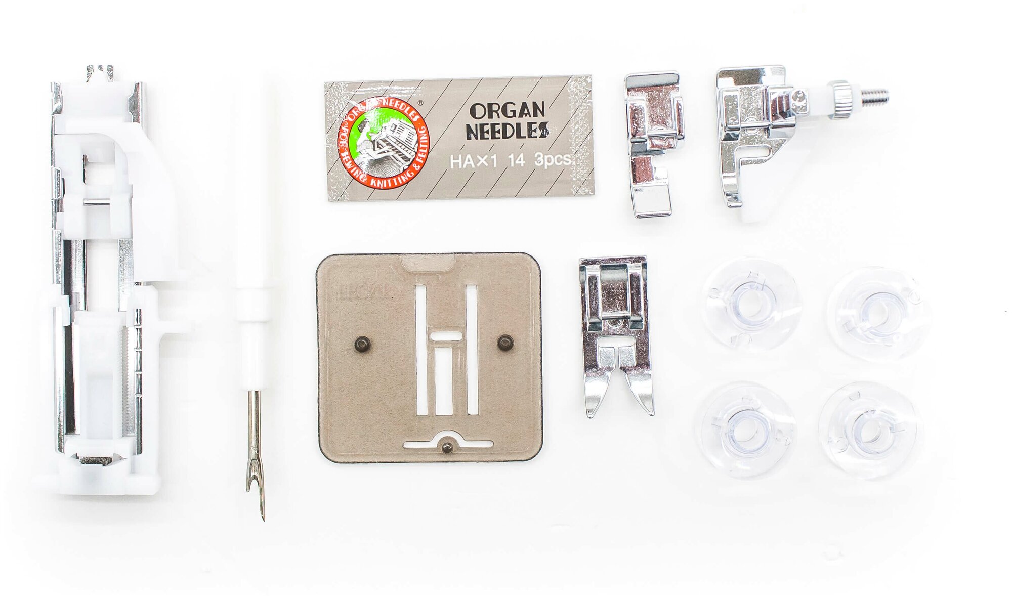 Вместе с устройством идут лапки разных видов, комплекты игл, нож для вспарывания, отвертка, шпульки, педаль. Также в наличие отсек для хранения аксессуаров и принадлежностей для шитья. Рукавная платформа швейной машинки поможет удобней обрабатывать маленькие и круглые участки ткани.