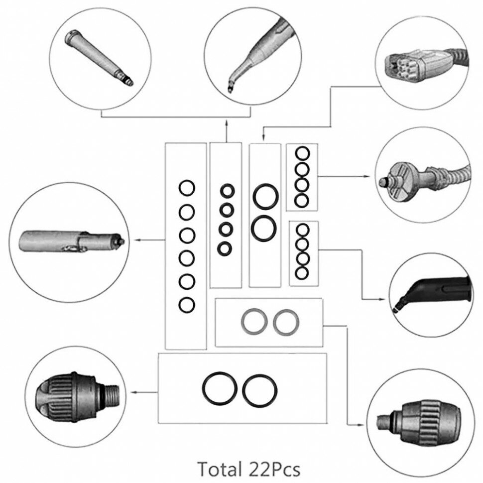 Комплект запасных колец используется для замены колец круглого сечения в различных принадлежностях к пароочистителям (в предохранительном затворе, точечном сопле, удлинителе, паровом шланге и разъеме утюга).