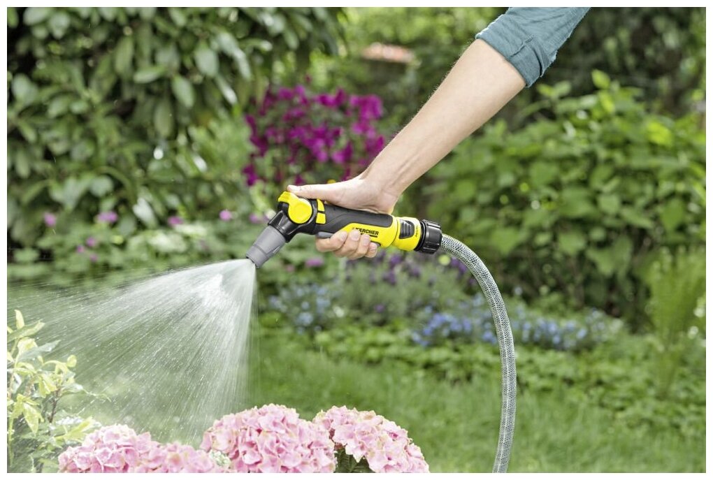 Только Karcher предлагает такой комфорт полива: поворотная головка может находиться в двух положениях — так, чтоб кнопка блокировки потока воды находилась сверху ручки пистолета или снизу. Поворотом регулятора — буквально одной рукой — можно выбрать необходимый режим распыления. Есть 2 режима распыления: точечная струя и конусная. Плавное переключение позволяет удобно поливать цветы и клумбы, а также эффективно смывать грязь с террас и садовой мебели. Все поливочные насадки Karcher оборудованы системой быстрого подключения и легко подключаются к садовому шлангу.