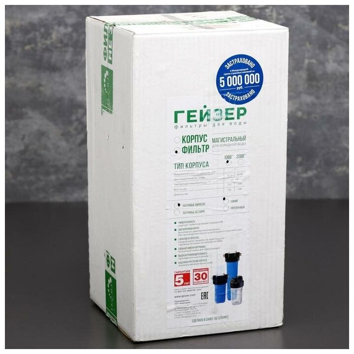 | Прочее | материал корпуса - пластик, тип корпуса - Big Blue 10'', очистка холодной воды от взвешенных частиц (ржавчины, песка и других нерастворимых примесей), степень очистки и производительность фильтра определяется установленным картриджемосадочным или картриджем из материала "Гейзер" |