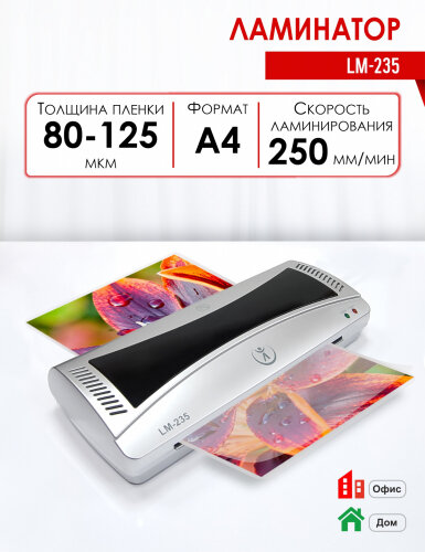 - недорогой и простой в работе ламинатор формата А4. Предназначен в основном для ламинирования объявлений, указателей, меню, пропусков, бэджей и другой печатной продукции. Отличный выбор для дома, офисов и организаций с небольшим объемом работ.