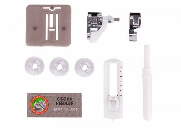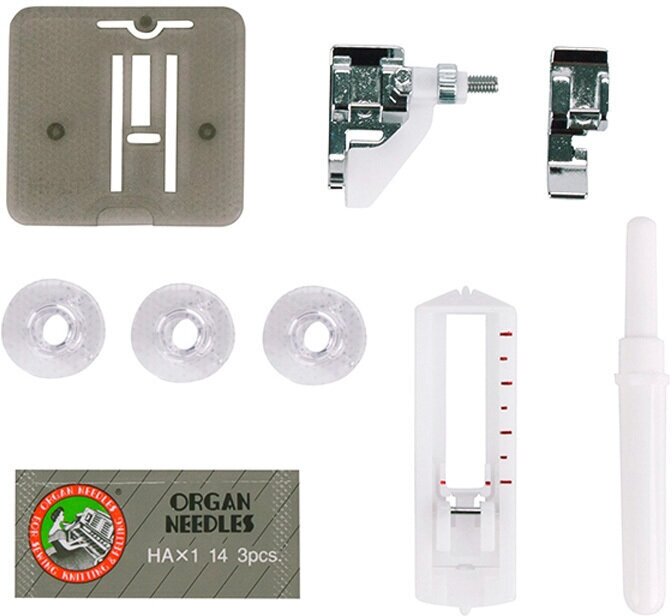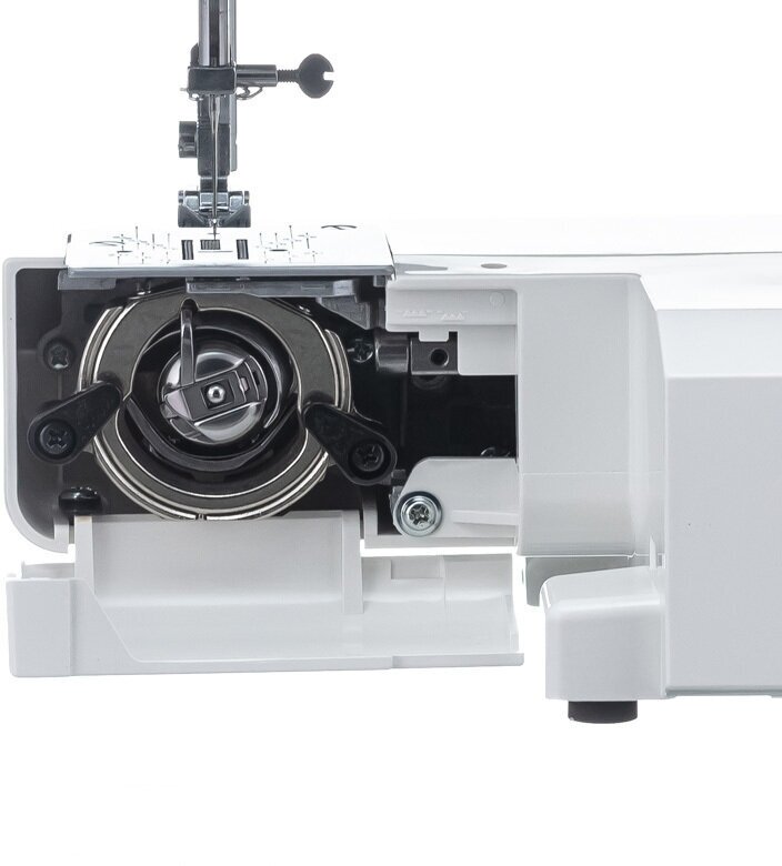| Комплект поставки | педаль; руководство по эксплуатации; отвертка; рамка для петли; иглы стандартные; шпульки; распарыватель; штопальная пластина; лапка универсальная; лапка для обметывания петель; лапка для вшивания молнии |