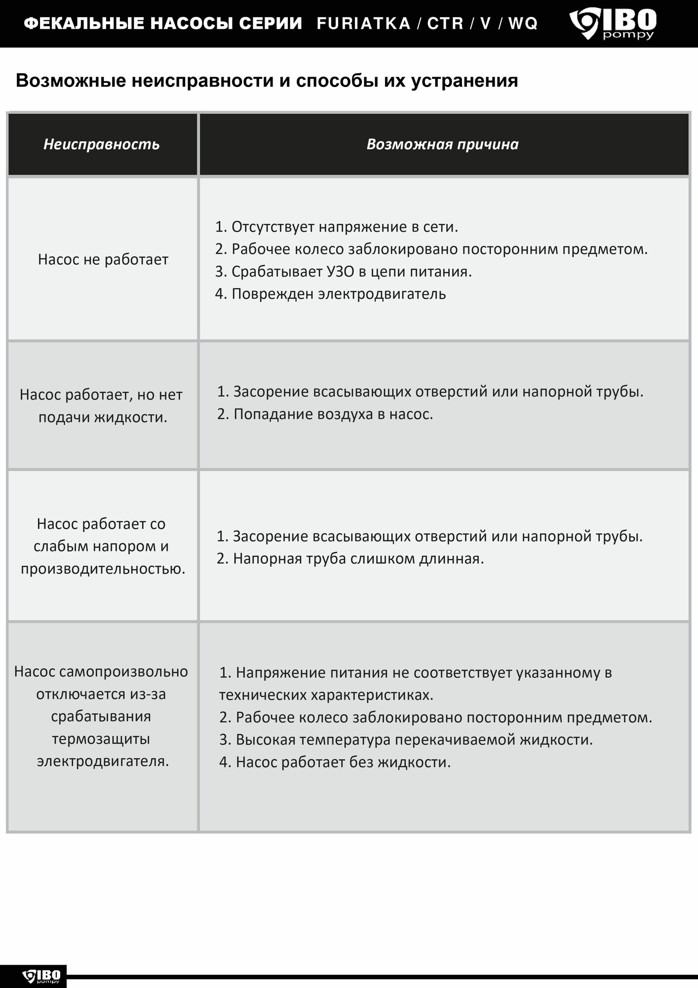 Брал для канализации. Насос сделан добротно и качественно. Чугун, поэтому и тяжелый. Фирма IBO, которая пользуется хорошей заслуженой репутацией. Понравилось, что режущий орган грамотно сделан. Насос мощный, производительный, с напором 18м и это чувствуется. Качает быстро. Кабель кстати 1.5 мм кв. Есть встроенный автомат для защиты насоса от перегрузки по току. В работе насос относительно не громкий. Покупкой доволен и считаю лучший насос в этой ценовой категории. Рекомендую. Отдельно спасибо ребятам с магазина, которые нашли конкретно этой мощности насос ( проблема найти в наличии) и доставили мне на следующий день.