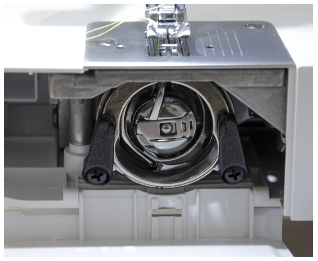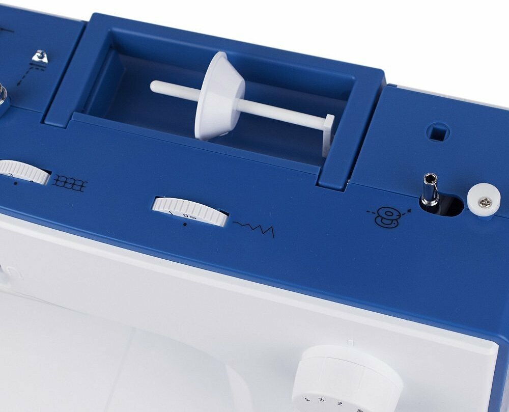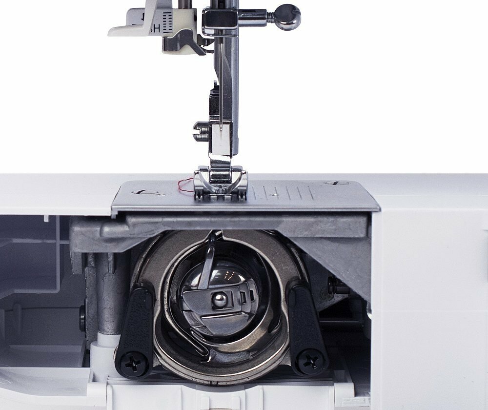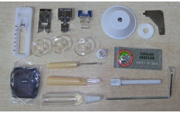 Комплектация: инструкция, катушкодержатель большой + малый, кисточка + нож-вспариватель, кромконаправитель для правой стороны, лапка для вшивания молнии, лапка для выполнения зигзага, лапка для выполнения пуговичных петель, лапка для пришивания пуговиц, масленка, набор игл, педаль, пластинка для штопки, стрержень для катушки длинный V, угловая отвертка, фетровая подкладка под катушку, чехол, шпульки