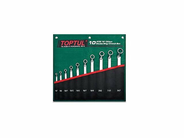 Набор ключей накидных TOPTUL состоит из 10 инструментов размером 6х7, 8х9, 10х11, 12х13, 14х15, 16х17, 18х19, 20х22, 21х23 и 24х27 мм серии AAEI0607-2427. Все ключи изогнуты на 75° для работы в труднодоступных местах. Набор оснащен удобным чехлом зеленого цвета с отдельным карманом для каждого ключа. Чехол можно повесить на стену. Рекомендуется для профессионального использования.