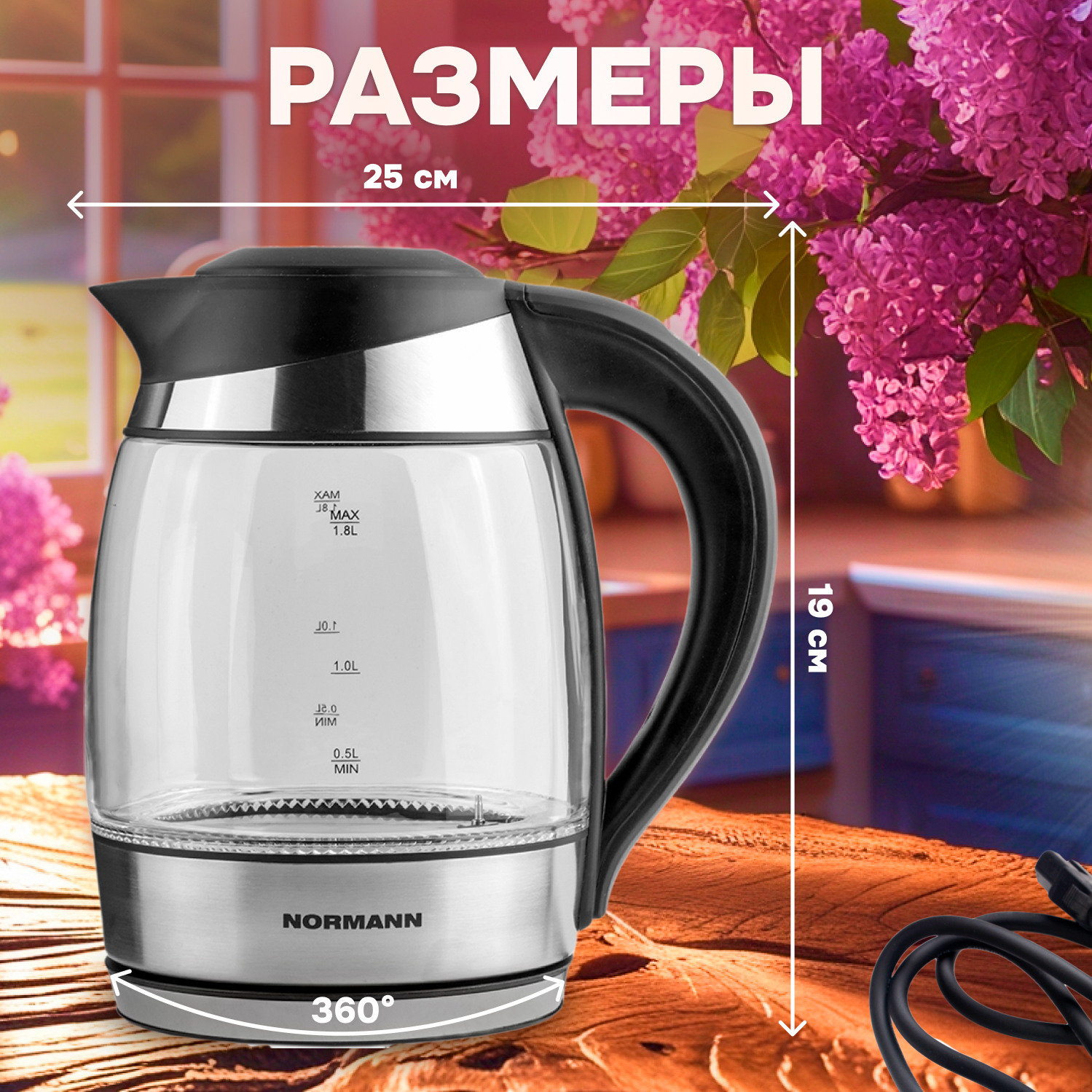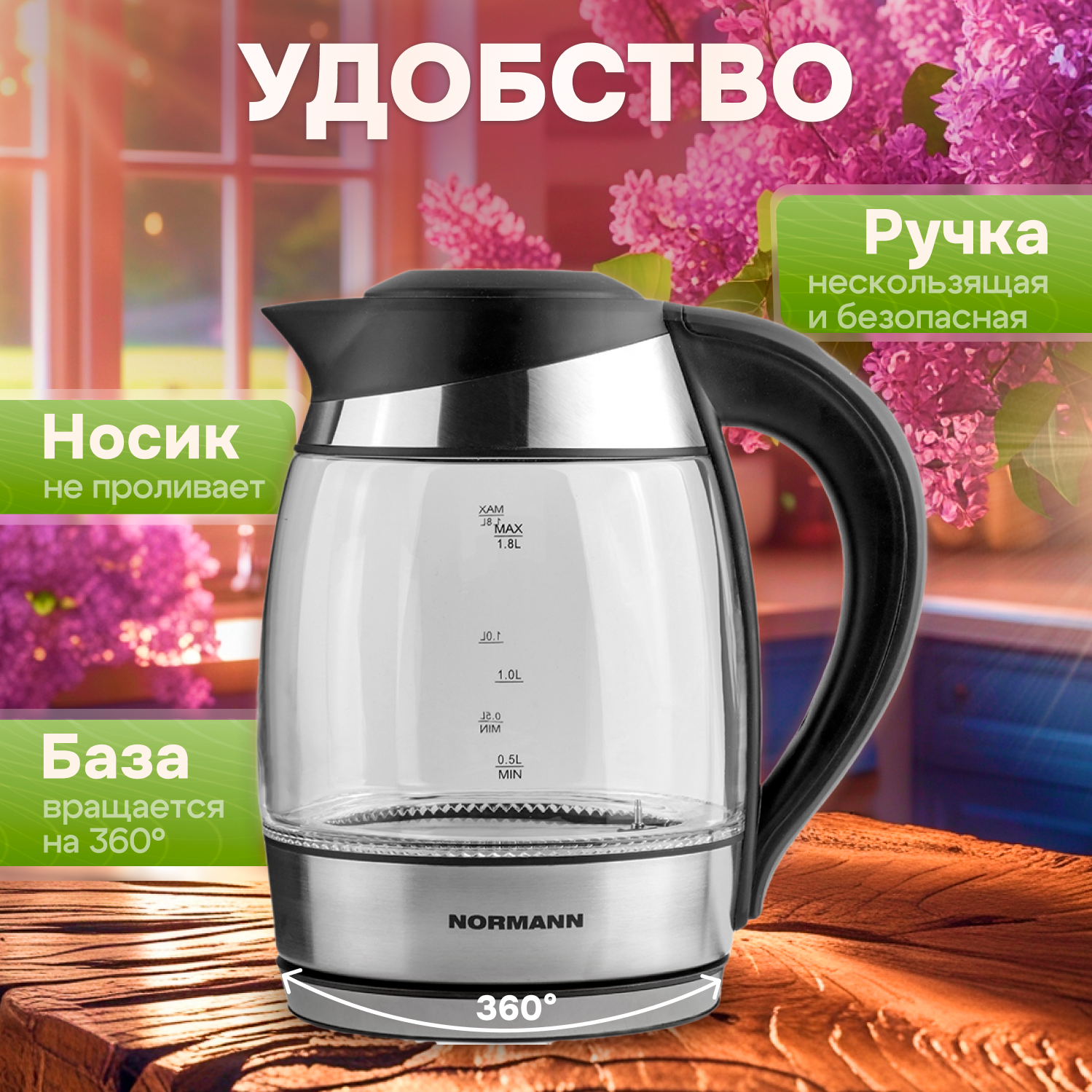 Чайник электрический Normann с функциями поддержания температуры и нагрева воды до нужной температуры (60°C, 70°C, 80°C, 90°C).