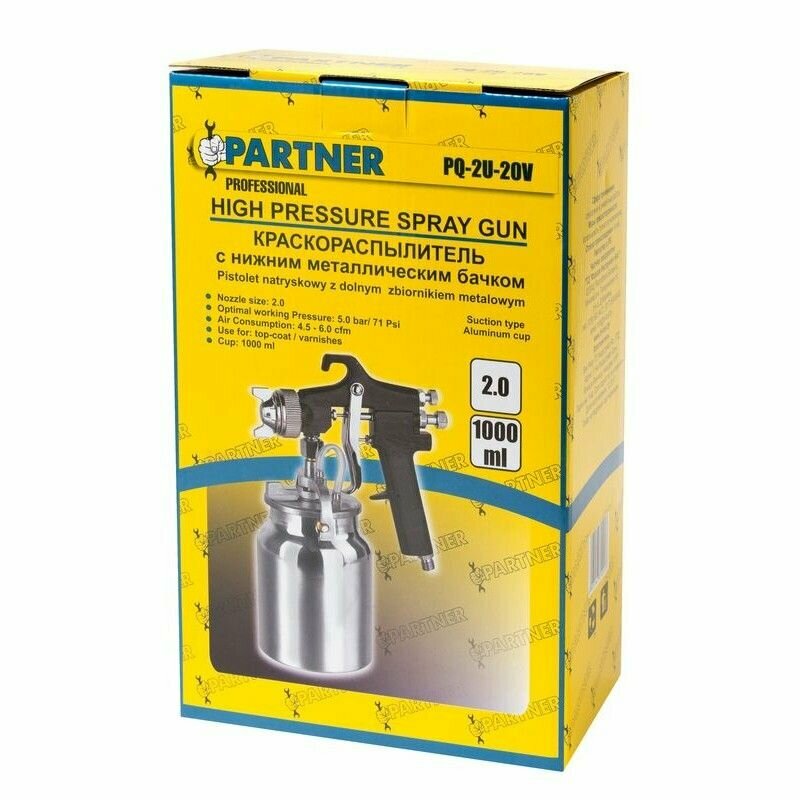 Краскораспылитель фирмы Partner с нижним металлическим бачком широко используется в различных областях для нанесения лаков, красок и грунтовок. Путем вращения наконечника по своей оси можно выставить необходимую форму факела. Нижний бачок обеспечивает лучший обзор рабочей области. Металлический корпус гарантирует долгий срок службы. Технические характеристики: - диаметр сопла 1.8 мм;
