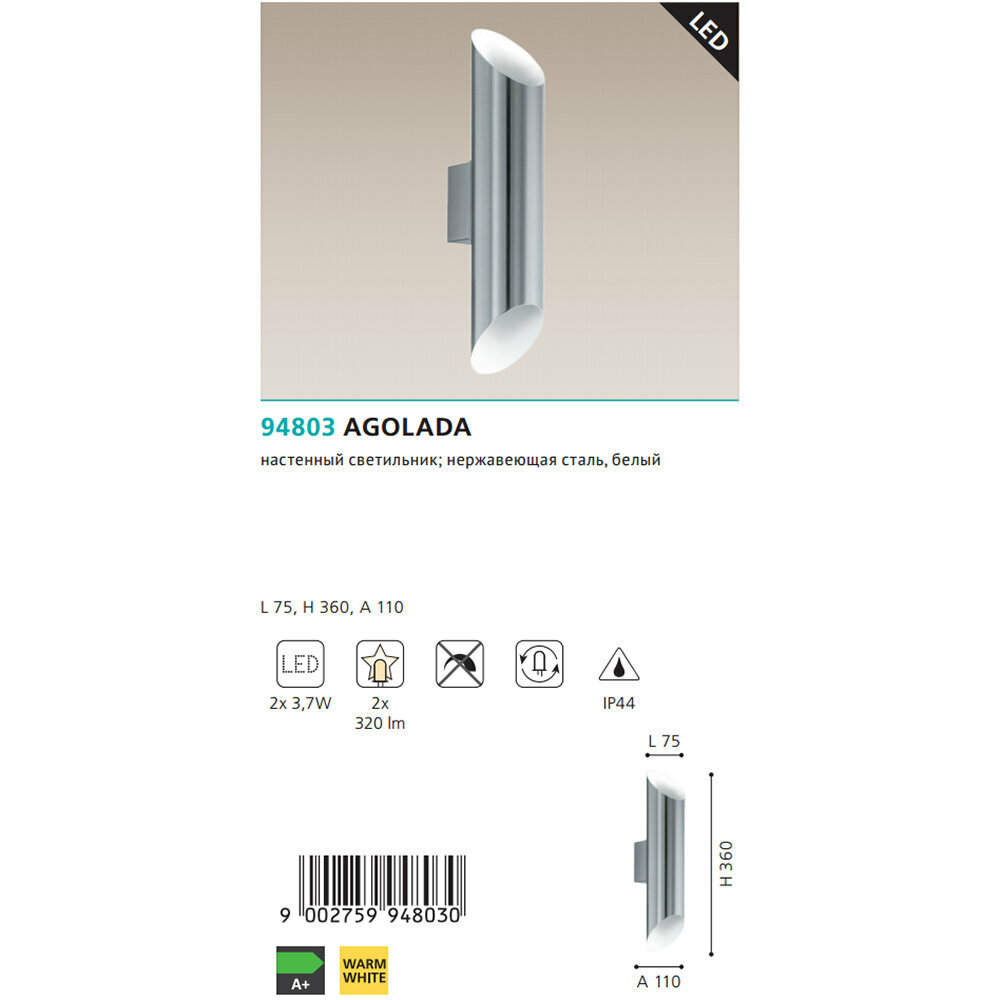 Архитектурная светодиодная подсветка Agolada - продукт известной компании Eglo (Австрия). Имеет максимальную мощность 7.4 Вт, освещает площадь до 1 кв. м. Отлично подойдет для таких мест, как сад, фасад. Впишется в интерьеры следующих стилей: модерн, минимализм, техно.