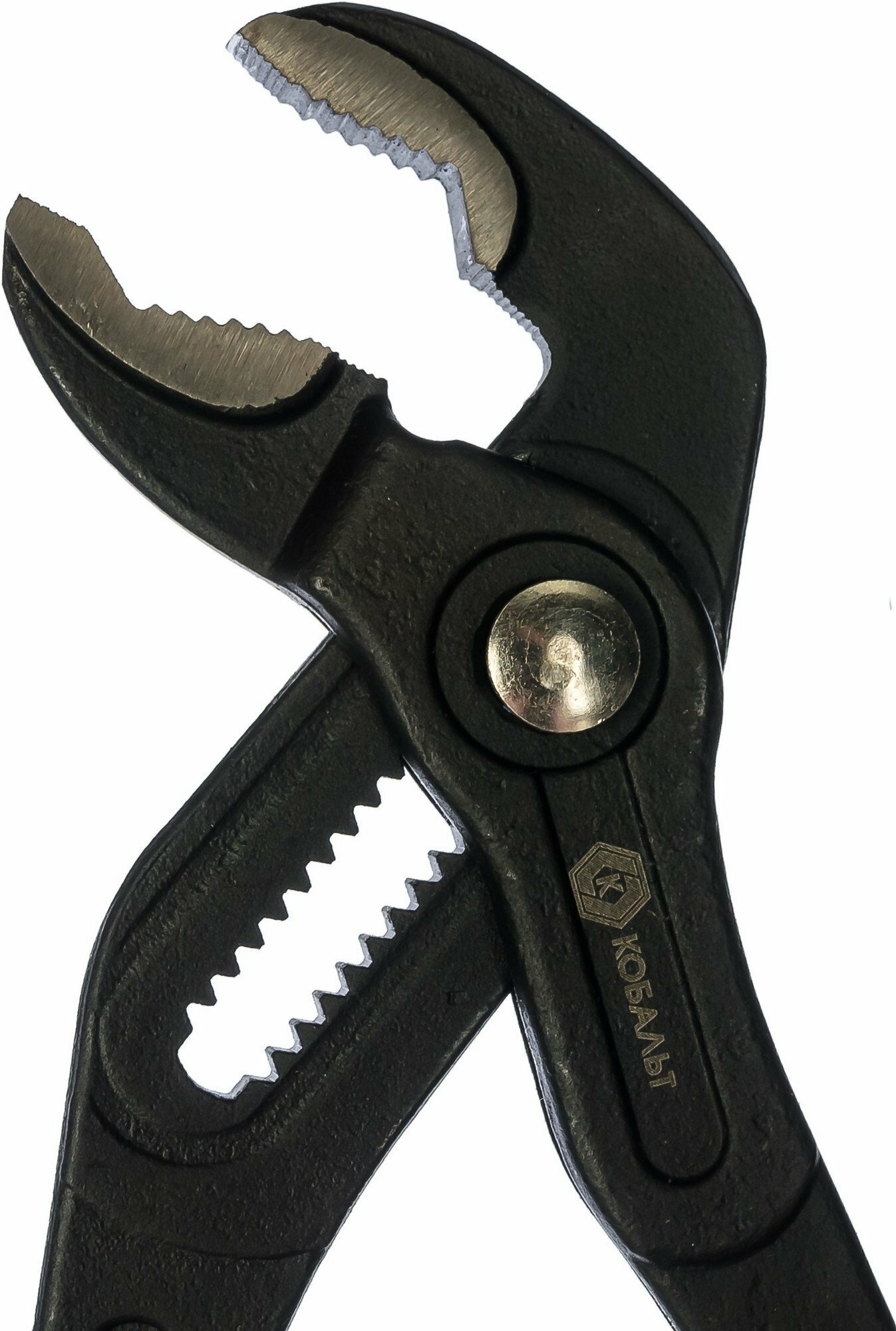КОБАЛЬТ предназначены для завинчивания/отвинчивания гаек трубных резьбовых соединений при монтаже инженерных систем; кратковременного удержания различных деталей во время обработки, гибки или правки, используя клещи в качестве ручных тисков. Также переставные клещи в ряде случаев хорошо заменяют разводной или трубный ключ, а также целый набор рожковых ключей. Изготовлены из хром-ванадиевой инструментальной стали (CrV) с закалкой рабочих поверхностей в масле до 49-52 HRC. Надежный двойной реечный механизм регулировки с кнопочным фиксатором позволяет быстро и удобно подобрать необходимую ширину захвата с минимальной дискретностью. Губки с насечкой максимально надежно фиксируют, даже поврежденную гайку или обрабатываемую деталь. Рукоятки покрыты ПВХ - изоляцией.