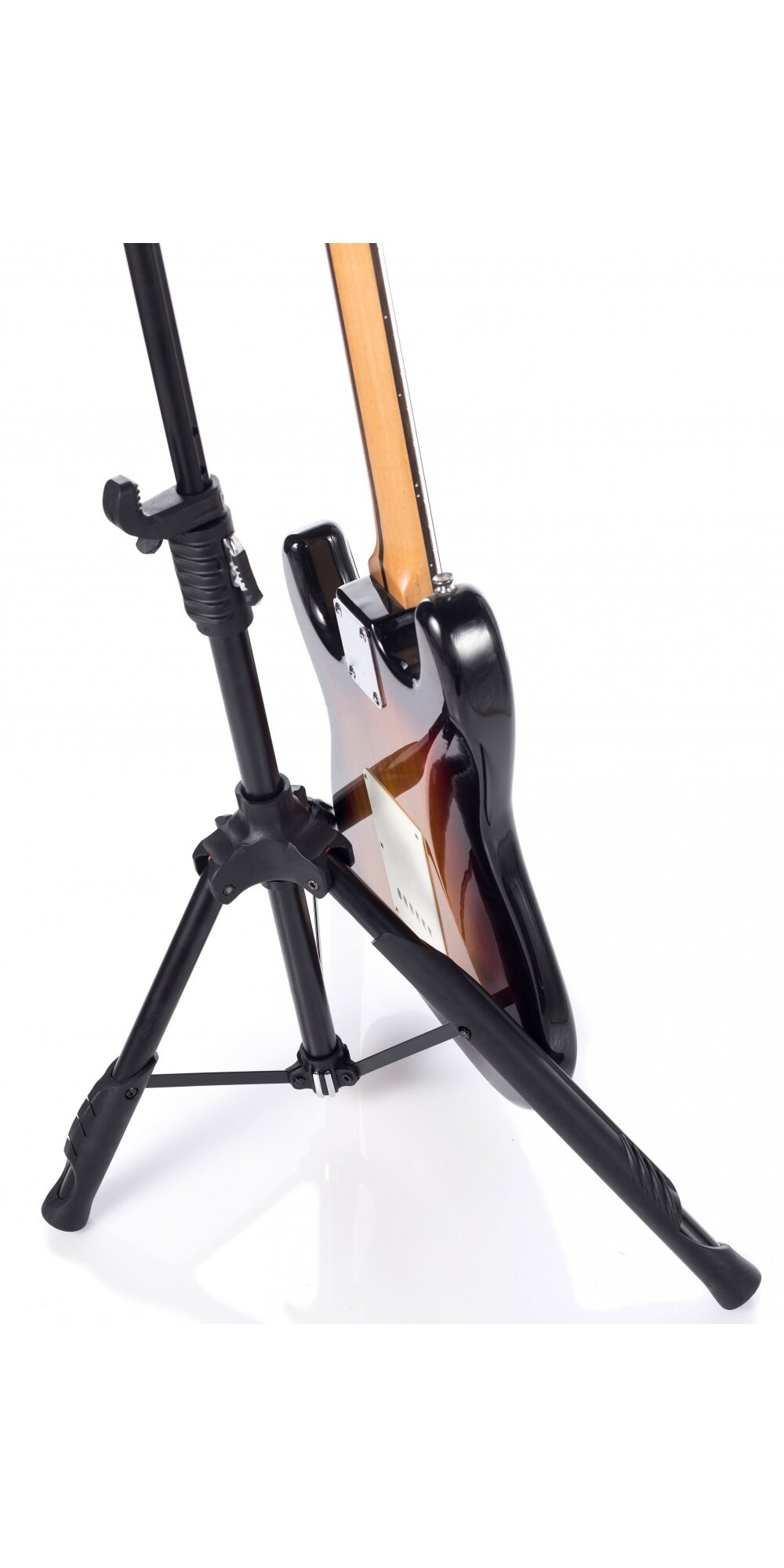 Универсальная стойка для гитары имеет систему автоматической фиксации у головы грифа. Конструкция выполнена из хромированного цинкового сплава, покрытого мягкой натуральной резиной, что обеспечивает стойке прочность и одновременно защищает поверхность гитары от повреждений.