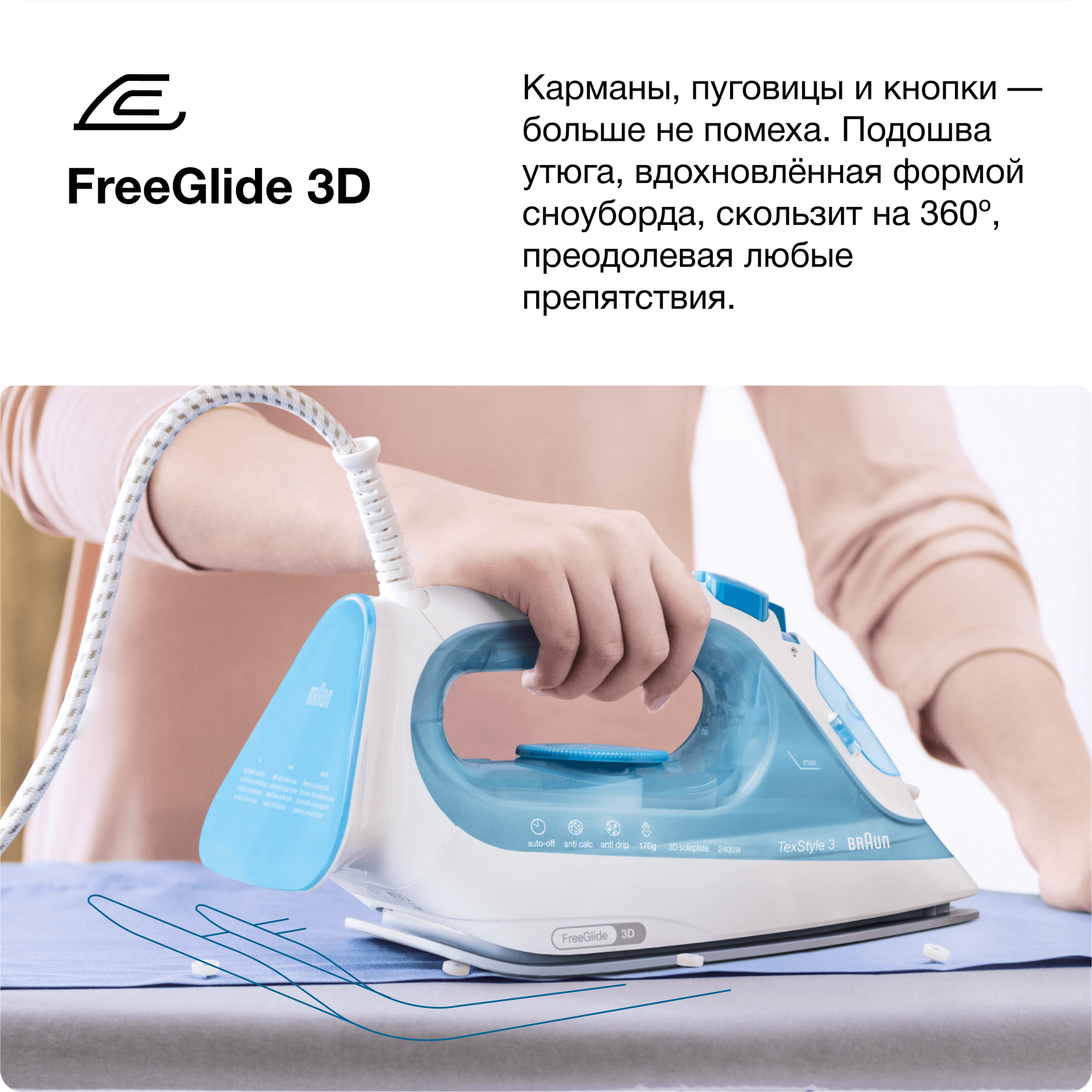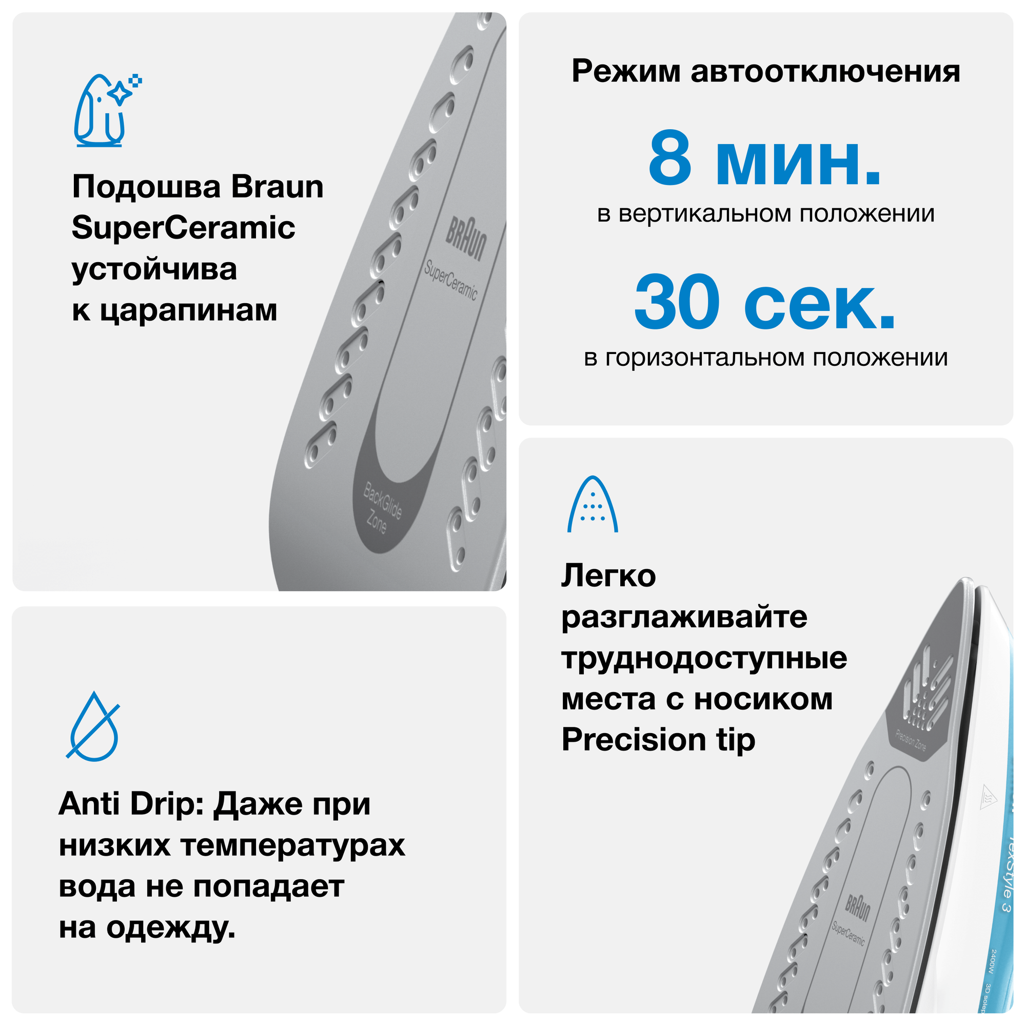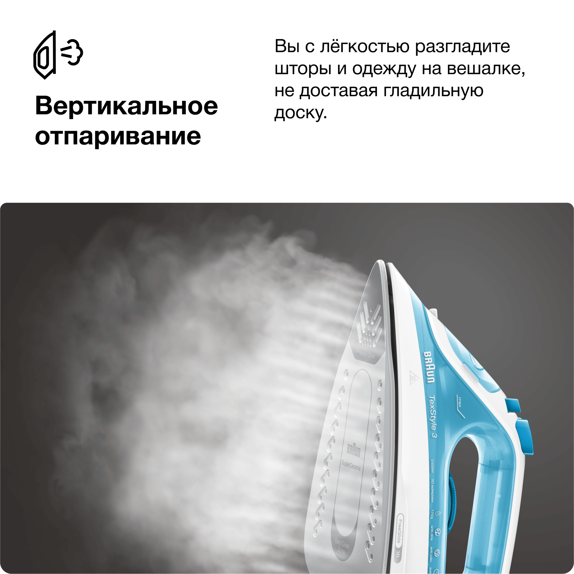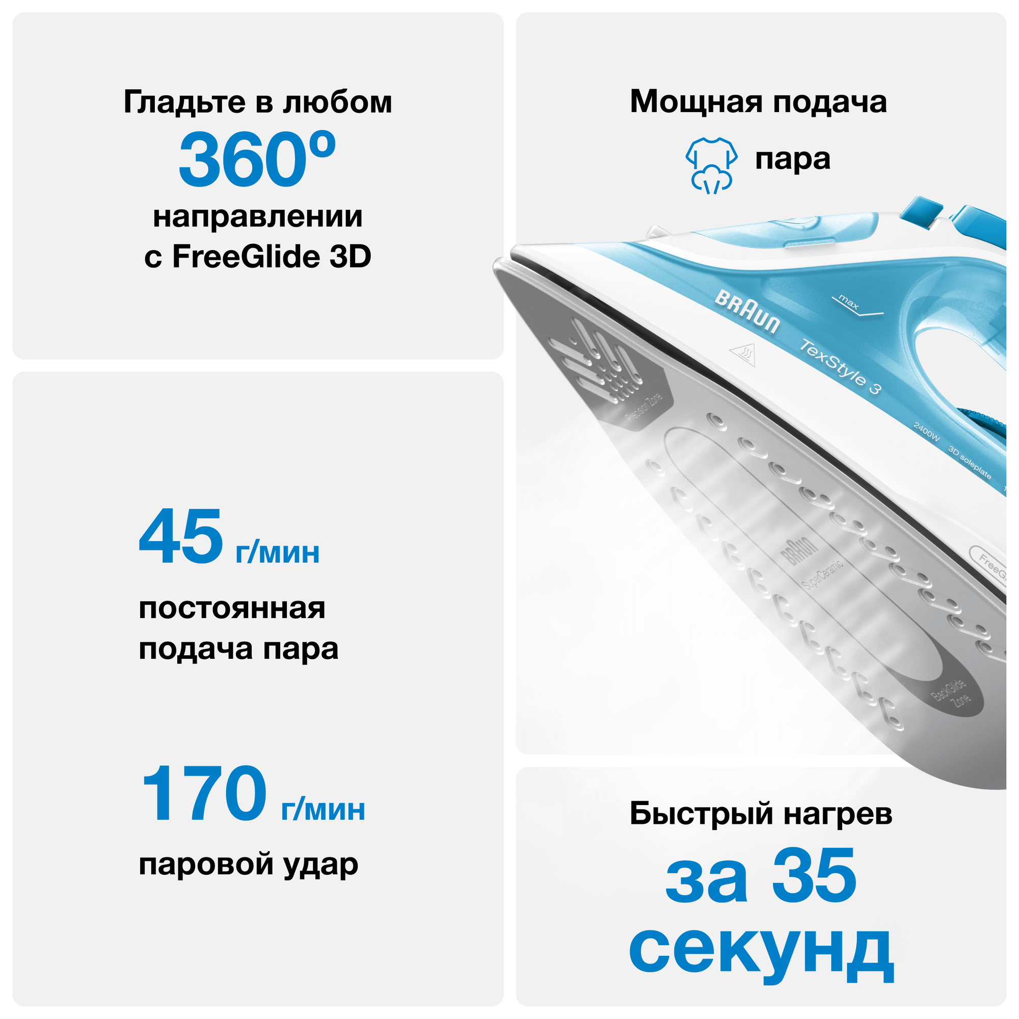 Braun TexStyle 3 SI 3053 BL — это утюг, который помогает быстро справляться с глажкой. Он отлично подходит для тех, кто ценит удобство, эффективность и простоту в быту. Благодаря мощности 2400 Вт прибор нагревается всего за 35 секунд. Нет необходимости ждать — утюг готов работать почти сразу после включения.