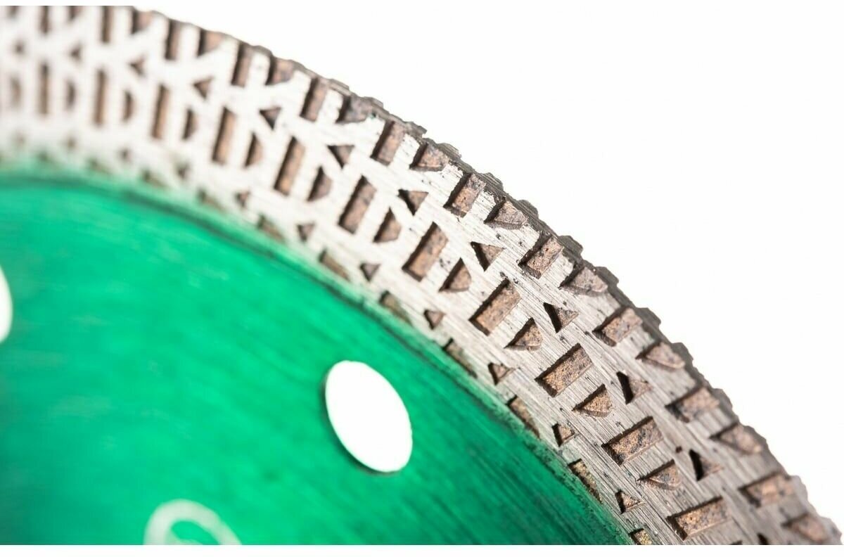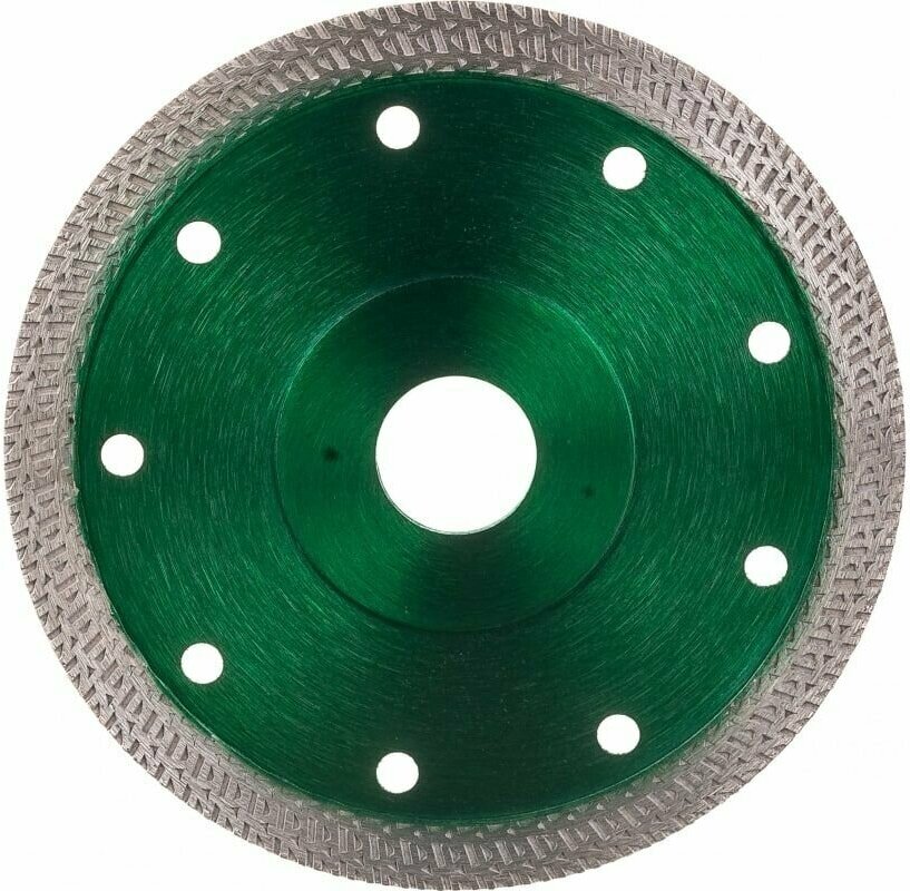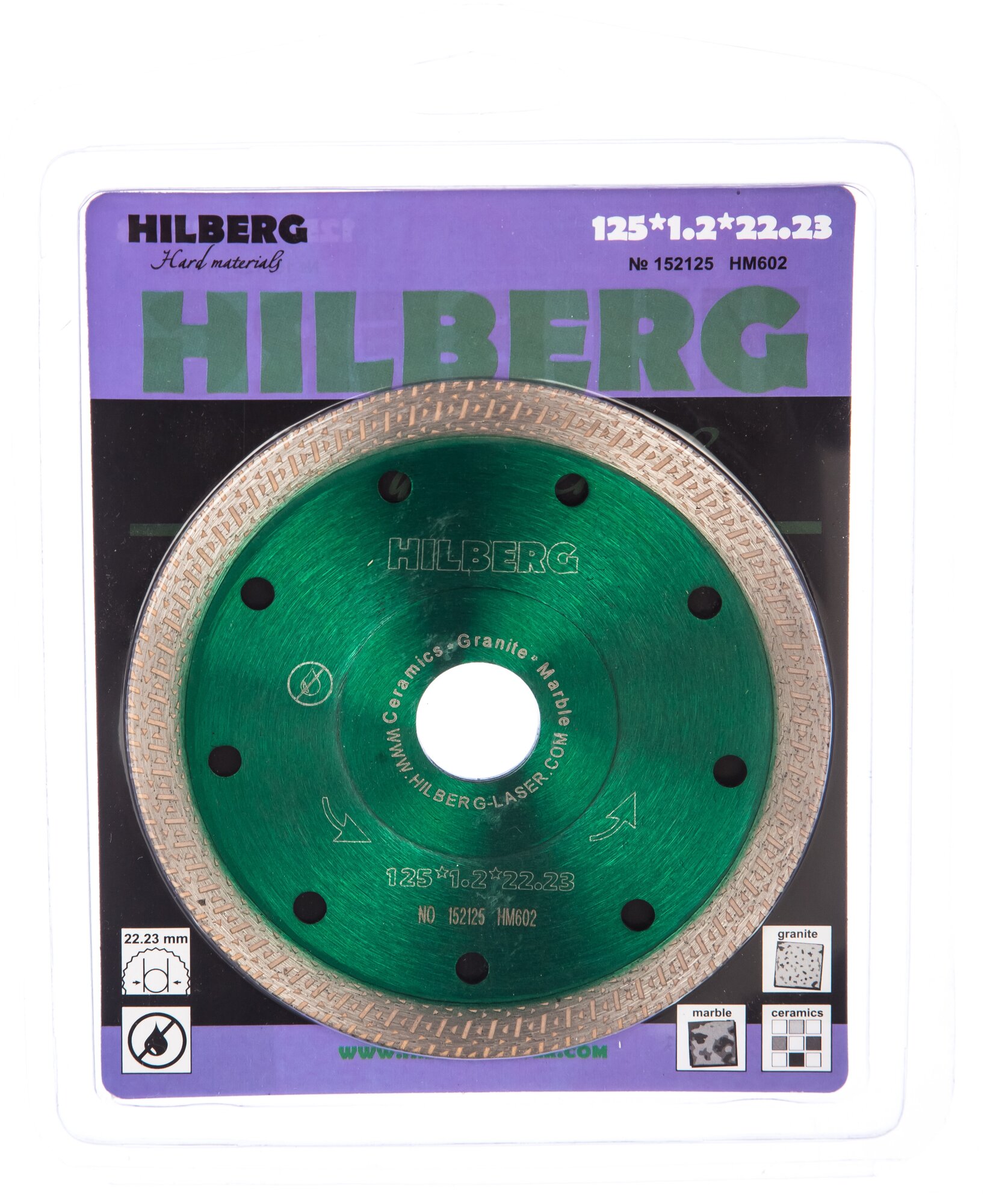 **Диск алмазный по керамике Hilberg ** предназначен для резки керамики и мрамора. Он имеет турбо-форму и ультратонкую режущую кромку, что обеспечивает чистый рез без сколов. Диаметр диска составляет 125 мм, толщина режущей кромки — 1,2 мм, а посадочный диаметр — 22,23 мм. Максимальная скорость вращения — 12200 оборотов в минуту.