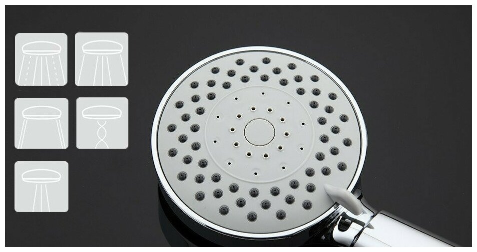 В целом хорошая лейка, качественная, 5 режимов, переключается хорошо. Но на мой взгляд есть один недостаток, в одном из режимов, когда подаётся вода из всех отверстий, с серединки сильно разбрызгивает, то есть если нужно просто принять душ и не мочить при этом волосы, в этом режиме так не получится