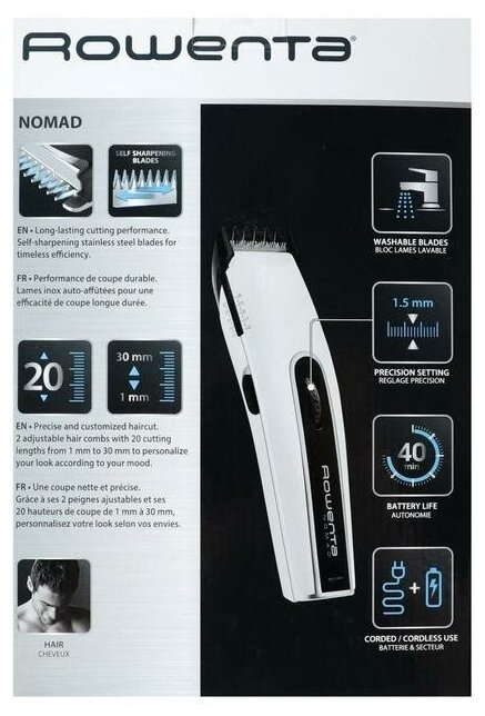 Лезвия машинки изготовлены из нержавеющей стали, что обеспечивает четкий срез. Благодаря специальной насадке вы без проблем сможете выбрать одну из 15 настроек длины – от 2 до 30 мм. Встроенный аккумулятор машинки Rowenta обеспечивает до 40 минут автономной работы, и во время использования прибора провод не будет вам мешать. Но при необходимости вы можете подключить устройство к сети.