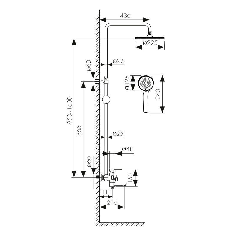 | В комплекте | верхний душ, держатель, штанга, смеситель, душевой шланг, лейка ручная, излив |