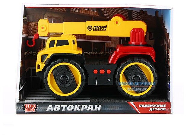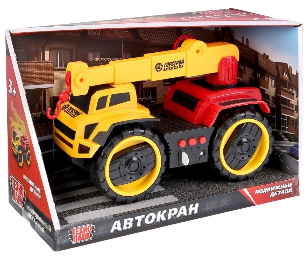 Автокран инерционный представляет собой новинку из пластика высокого качества. Модель выполнена в жёлтом цвете с чёрными и красными элементами. Большие колёса легко вращаются и не препятствуют движению машинки. Кран можно поднимать и опускать.