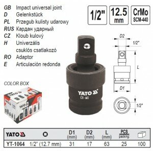 Кардан ударный 1/2" Yato - позволяет работать с крепежом под любым углом, что особенно актуально при работе в местах с ограниченным доступом.