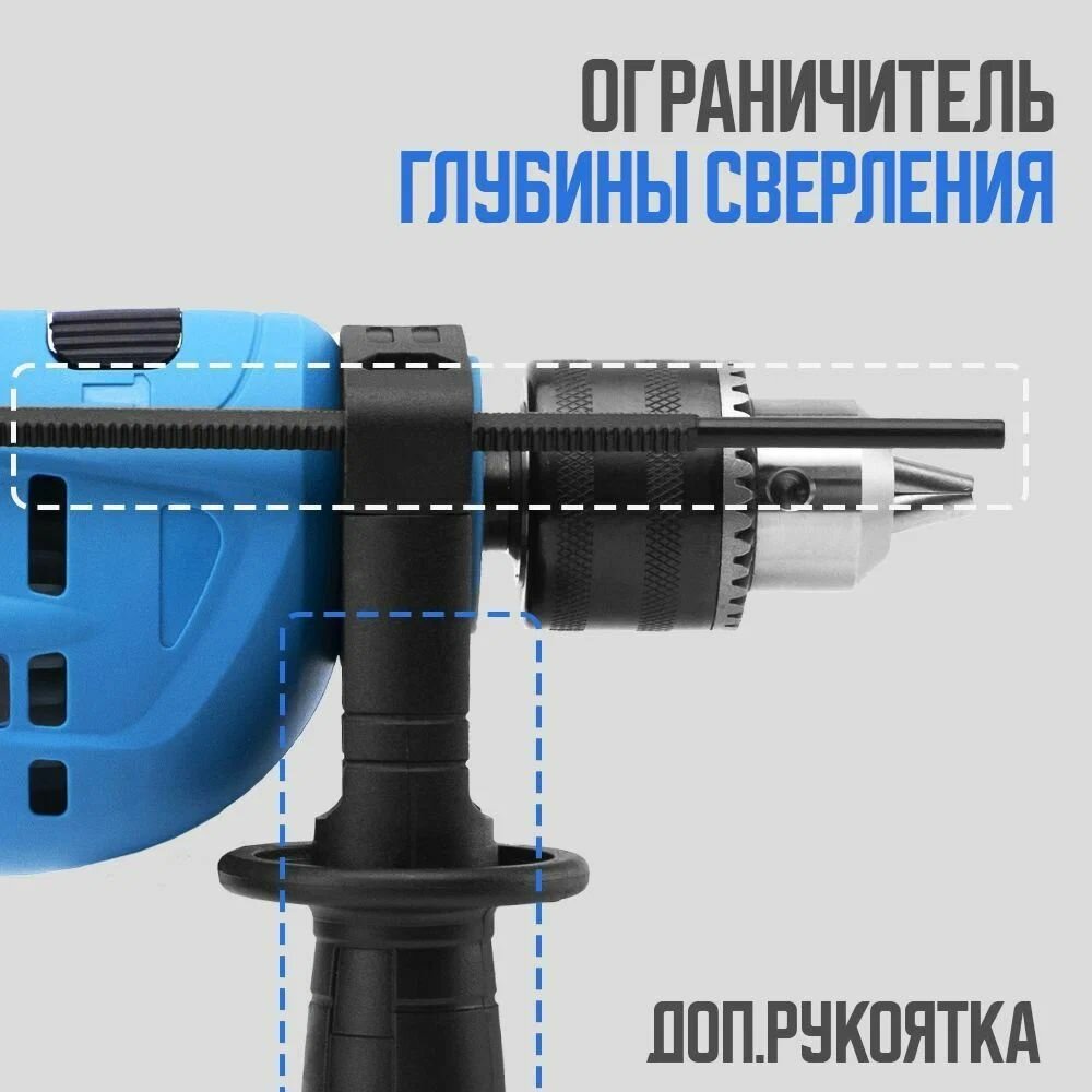 Прибор оснащен ключевым патроном, позволяющим использовать сверла с диаметром 1,5-13 мм. Система дополнена функцией реверса, ограничителем глубины сверления и дополнительной рукояткой для более устойчивого положения инструмента. Устройство весит 1,8 кг, а его размеры составляют 6x20x26 см.
