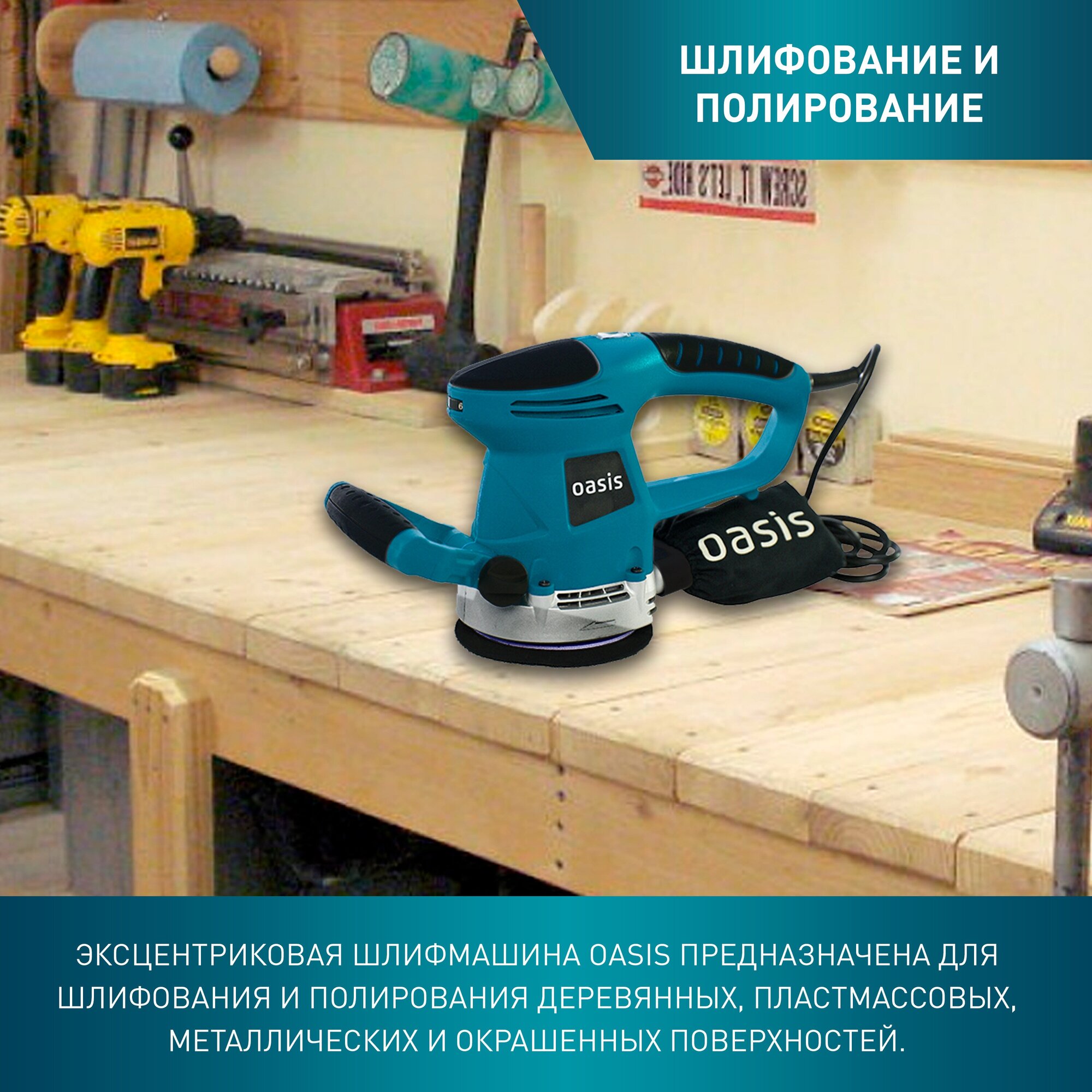 Вибрационная эксцентриковая шлифовальная машина Oasis – это инструмент, предназначеный для шлифования и полирования деревянных, пластмассовых, металлических и окрашенных поверхностей при помощи одновременных движений подошвы вокруг своей оси и по орбите.