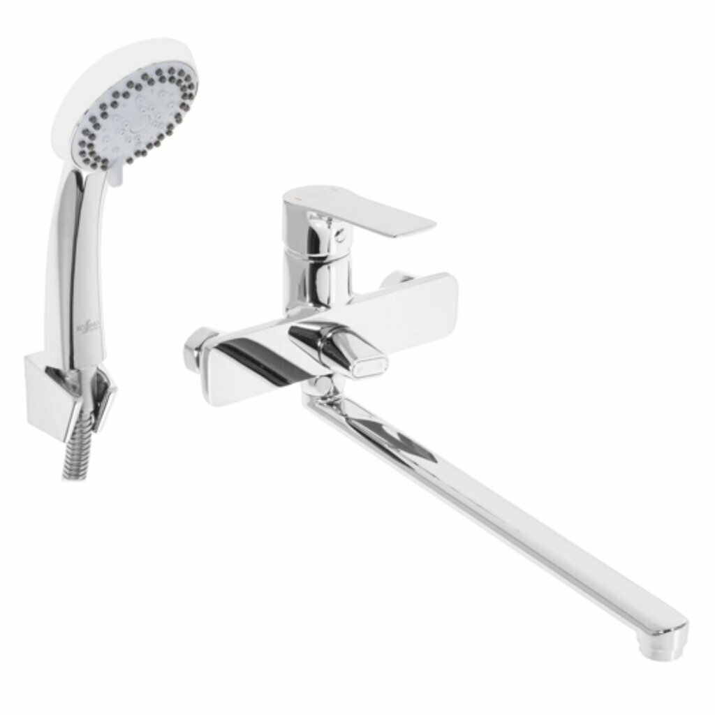 Смеситель универсальный Rossinka Silvermix для ванны и раковины с поворотным изливом, с душевым гарнитуром. Пластиковый аэратор с функцией легкой очистки. Переключатель с керамическими пластинами.