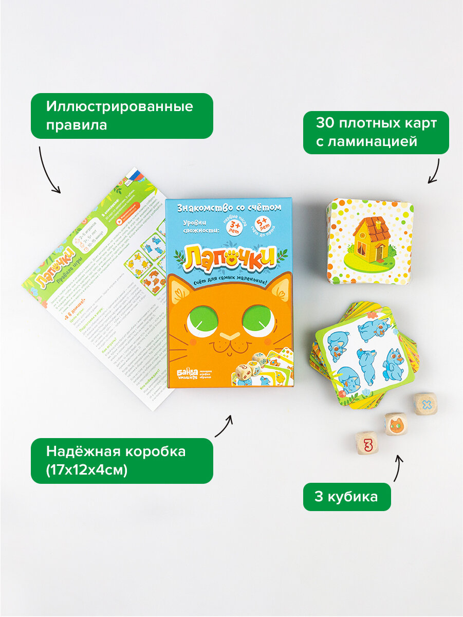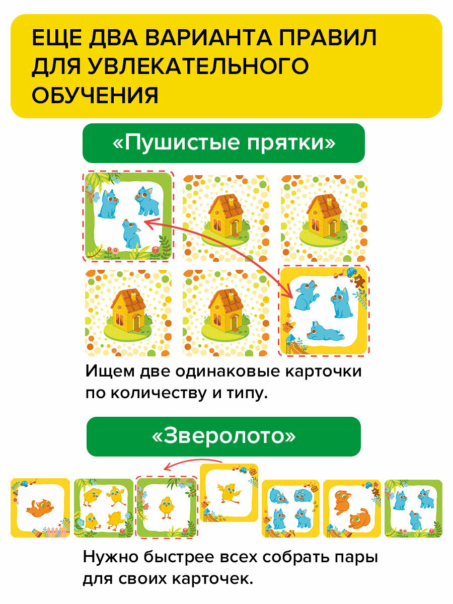 Главная задача игрока — найти карточку с нужным количеством зверят. А в усложненном варианте правил игроки делают это наперегонки. В результате у ребенка возникает приятная забота — посчитать зверят и скорее найти нужную карту. Со временем дети учатся определять количество зверят, как бы «фотографируя» карточку, и пересчитывать каждый раз уже не приходится.
