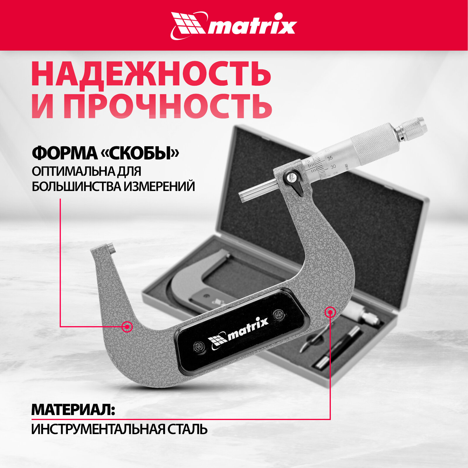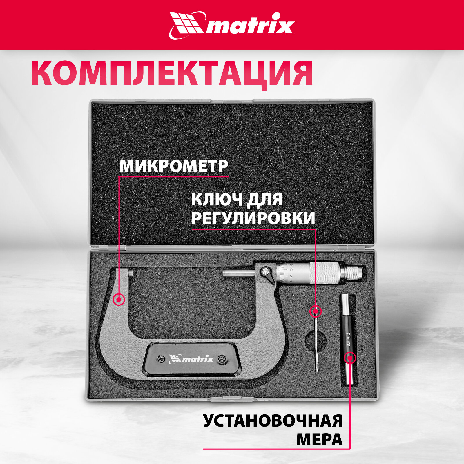 | Дополнительная информация | Механический микрометр MATRIX 317005 служит для выполнения особо точных измерений. Корпус выполнен в форме скобы и изготовлен из высокопрочной инструментальной стали, что определяет долговечность и надежность данного инструмента.,Имеет форму скобы.,Основным рабочим элементом является микрометрическая головка.,Упакован в пластмассовый кейс.,Предназначен для особо точных измерений. |
