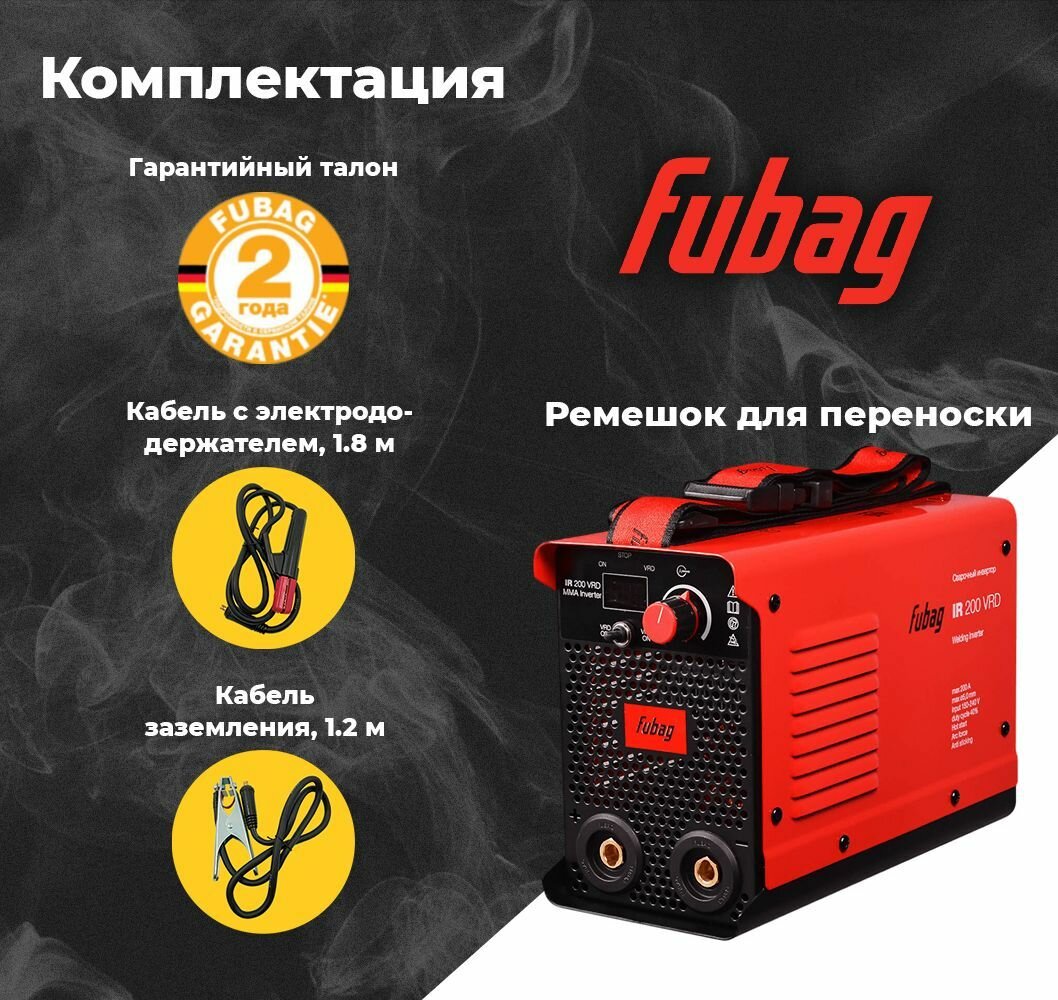| Комплектация | кабель заземления (массы) (1.2 м), кабель с электрододержателем (1.8 м) |