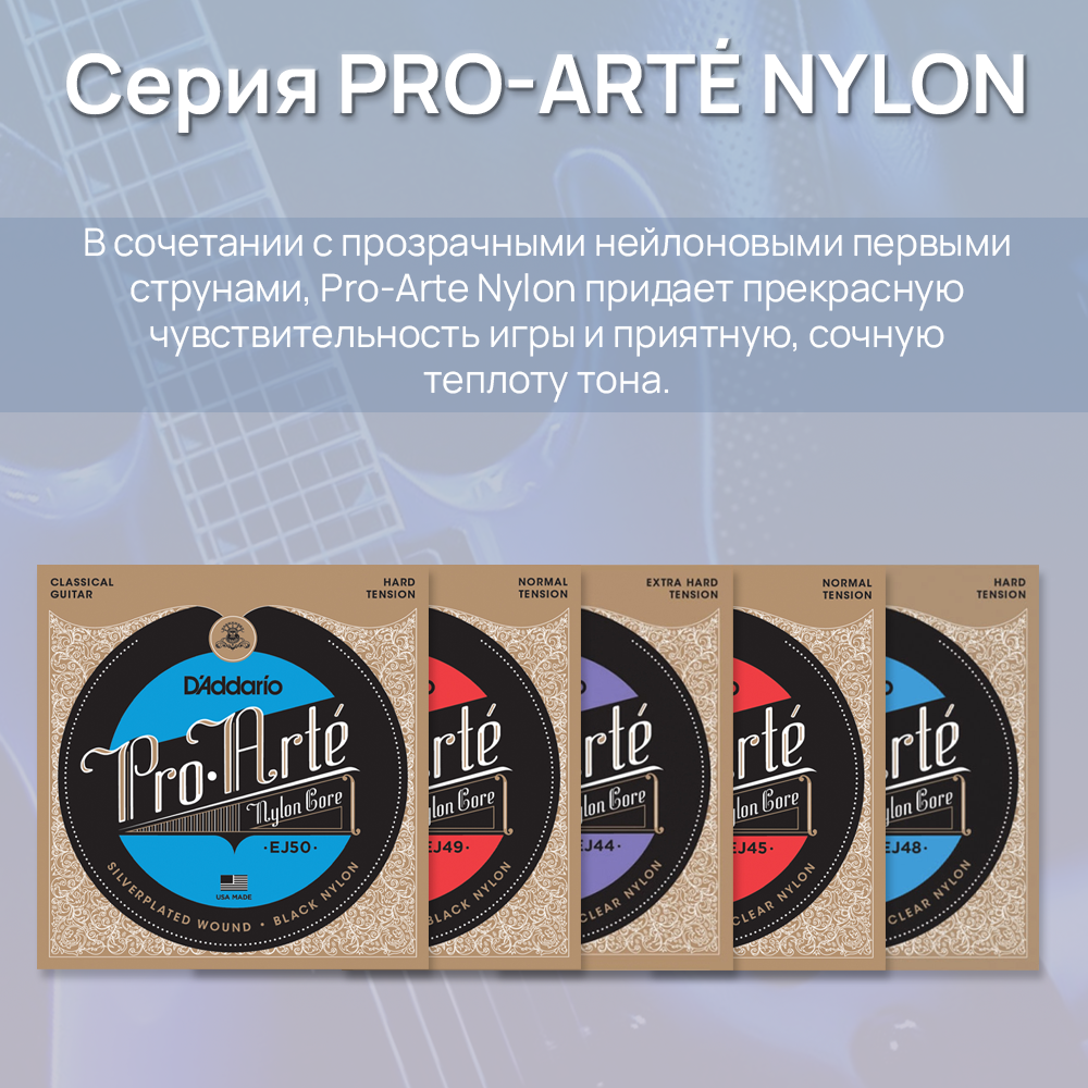 Струны D'Addario серии Pro-Arte являются самыми популярными струнами премиум-класса для классической гитары. Все струны серии Pro Arte отбираются при помощи сложной лазерной установки с компьютерным управлением, выполняющей тысячи операций измерения диаметра и натяжения струн для обеспечения точности звучания и калибровки каждого комплекта. Обмотка басовых струн Pro-Arte выполняется из посеребренной меди на сердечнике из многоволоконного нейлона и обеспечивает наполненное теплое и рельефное звучание.