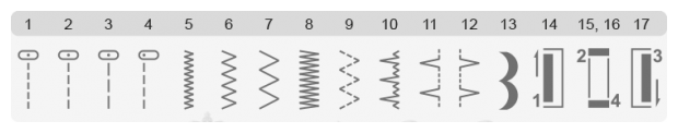 | Комплект поставки | универсальная лапка (4), большой и маленький держатели катушки (12,13), вспарыватель шва со щеткой для чистки машины (2), машинное масло (1), лапка для выметывания петли (15), дополнительный стержень для шитья двойной иглой (11), лапка для пришивания молнии (5), лапка для пришивания пуговицы (6), отвертка (3), шпульки (10), направляющая для квилтинга (14), запасные иглы (7), пластина для штопки и вышивки (8), фетровая подушечка для катушки (9). |