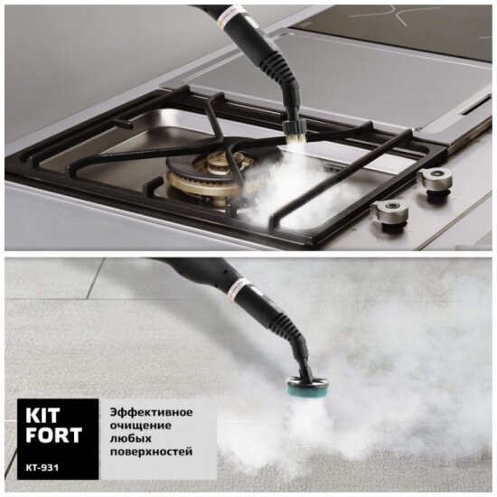 Купила Китфорт и теперь играю уже какой день)) Отлично отмывает загрязнения без всякой химии. Но надо запастись бумажными полотенцами или тряпочками для вытирания грязи следом) Чуда ждать в очень загаженных местах не стоит, придётся потрудиться, но для меня это явно удобней и быстрее, чем тряпочкой/водой/химией. Ничего не надо смывать, просто отпарили и вытерли. Небольшие загрязнения типа фасадов кухни отмывает вообще идеально! Кухня начинает сверкать просто))