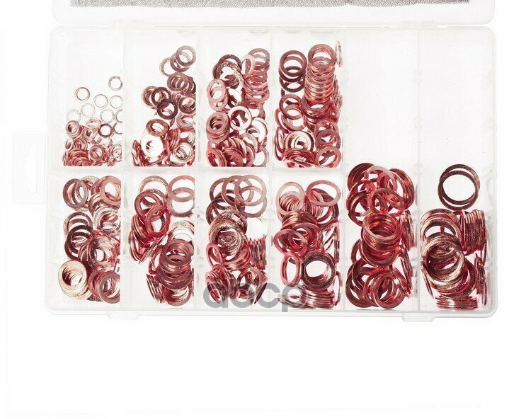 Набор медных шайб, 500шт JTC используется для быстрого и качественного уплотнения соединений в различных системах автомобиля (ходовая часть, форсунки и т.д.). В комплекте предусмотрены 10 типоразмеров шайб (10 видов по 50 шт.), что позволяет применять их к большинству существующих марок автомобилей. Специальная таблица на крышке бокса позволяет быстро подобрать нужную по размеру шайбу. Для установки данных изделий от пользователя не требуется каких-либо специальных знаний или умений. Вес - 0.995 кг.Преимущества Все изделия набора медных шайб, 500шт обладают повышенной прочностью и износостойкостью Удобный пластиковый кейс с замком-защелкой Габаритные размеры кейса: 280х180х45 мм Низкий вес Не занимает много места Простота эксплуатации Долгий срок службы