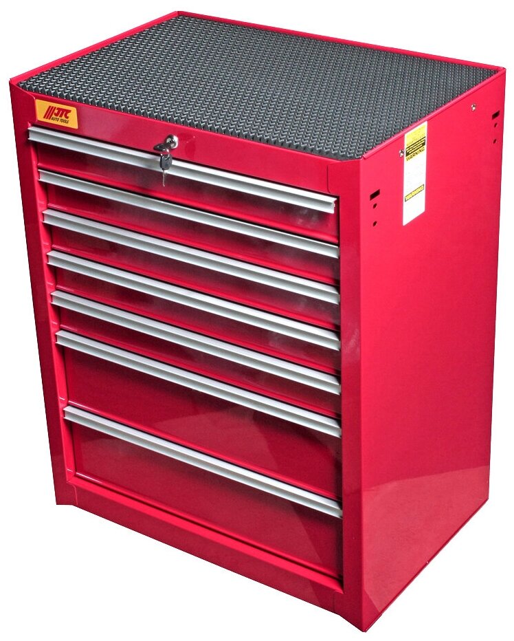 Тележка инструментальная красная JTC. 7 секций. Размеры ящиков подходят для всех наборов инструментов JTC К-серии. Все ящики оснащены роликовыми направляющими, полностью выдвигаются и легко вынимаются из тележки. Усиленные колеса. 5х2, 2 прямых и 2 поворотных. Конструкция с двойными стенками.