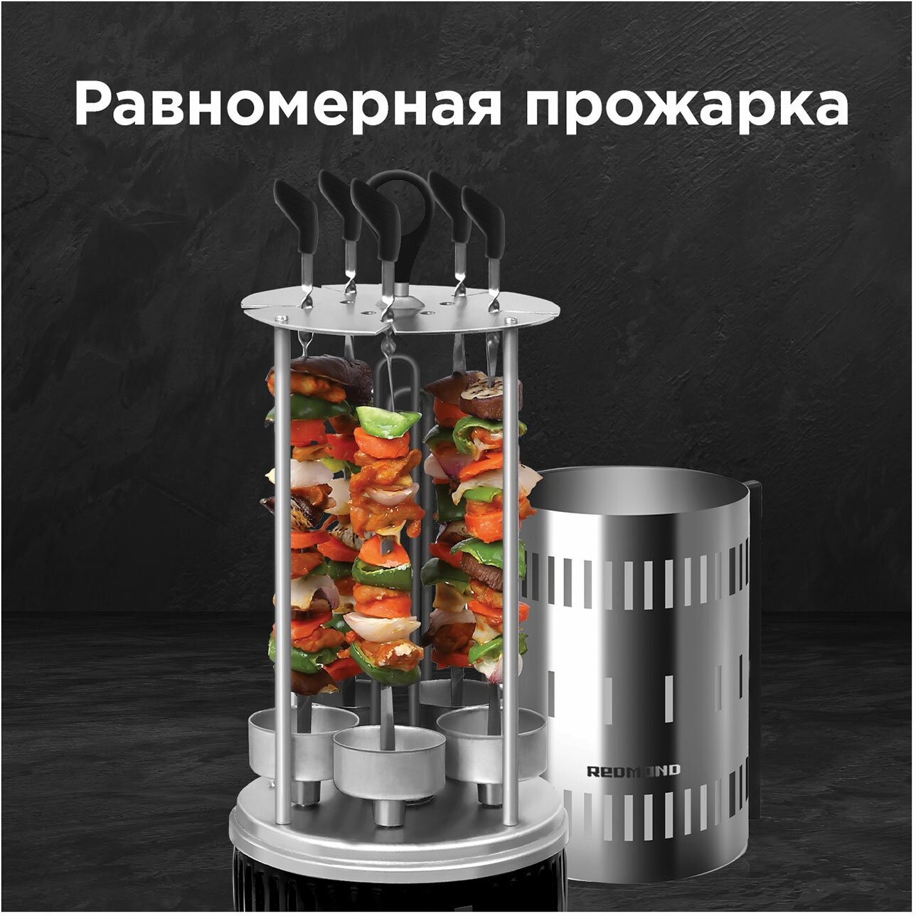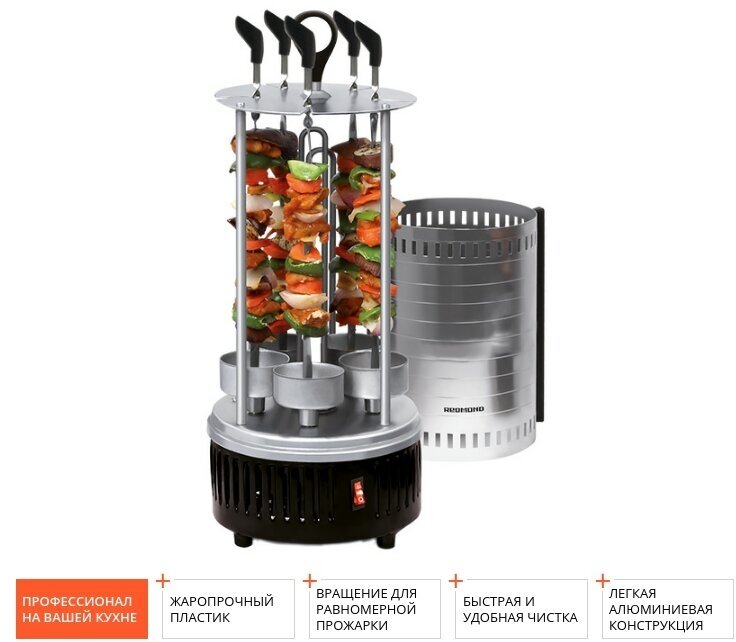 Электрошашлычница Redmond будет отличным приобретением для всех любителей полакомиться свежим шашлыком. Теперь вам не придется ждать лета для открытия шашлычного сезона! Побалуйте себя данным блюдом в течение круглого года. Кварцевый инфракрасный трубчатый излучатель вместе с кожухом-отражателем в виде цилиндра воспроизводят действие жара от раскаленных древесных углей. Шампуры выполнены из нержавеющей стали, которая абсолютно безопасна и никоим образом не влияет на вкус приготовленных блюд.