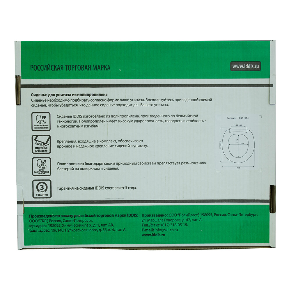 • Гарантия на сиденье для унитаза IDDIS® 3 года, чтобы вы были уверены в его надежности и высоком качестве.