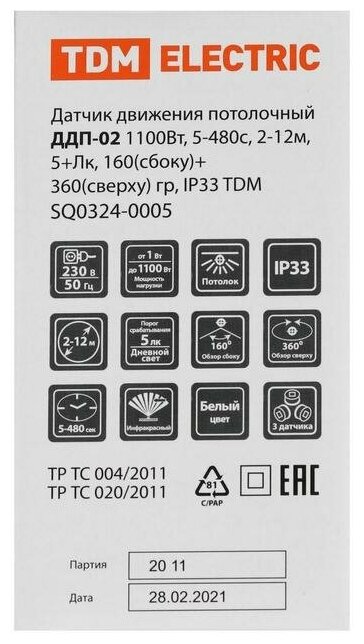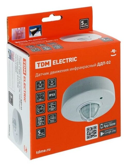 TDM Датчик движения потолочный ДДП-02 1100Вт, 5-480с, 2-12м, 5+Лк, 160сбоку+360сверху гр, IP33