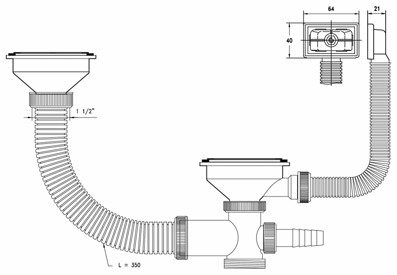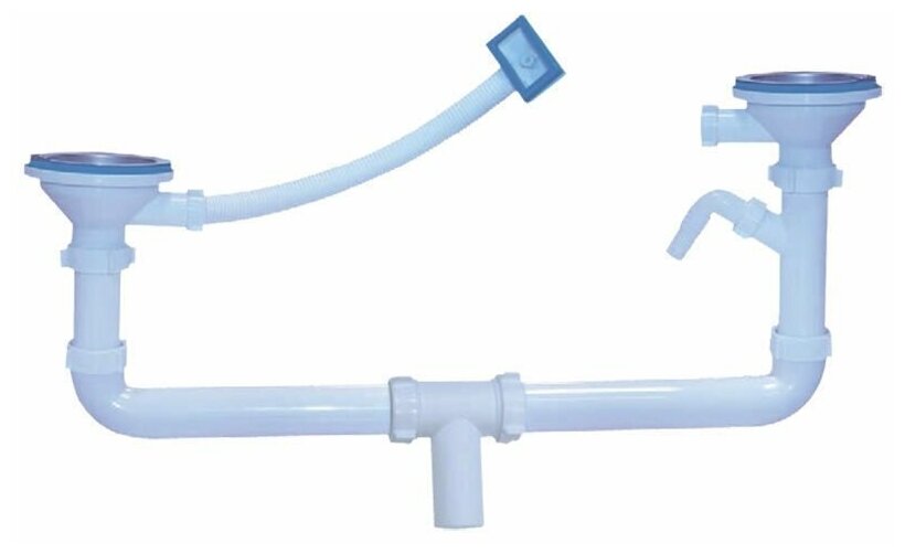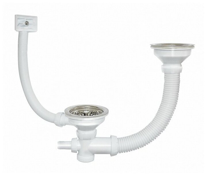 В комплекте поставки: 2 выпуска из нержавеющей стали, 2 прокладки (для установки на прямоугольную или круглую чашу), соединительные трубки, отвод для подключения к стиральной или посудомоечной машине, инструкция.