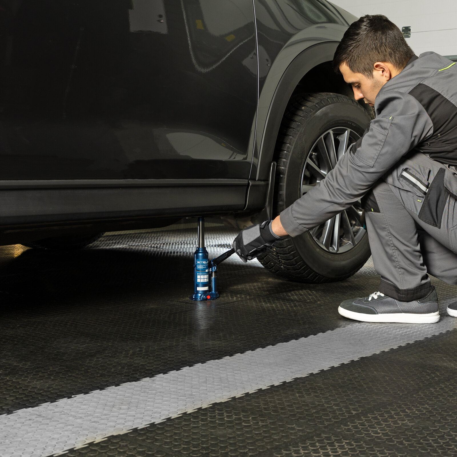 • Компактный гидравлический домкрат с телескопическим механизмом для быстрого подъема груза массой до 2 тонн.