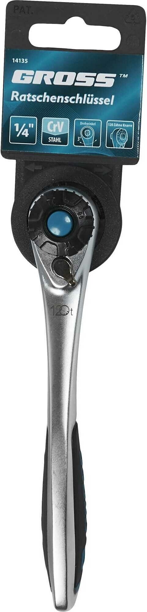 Трещоточный ключ Gross с присоединительным квадратом 1/4 дюйма предназначен для работ с резьбовыми соединениями. Храповый механизм со 120 зубцами обеспечивает исключительно плавный ход. Инструмент оптимален для работы с труднодоступными крепежами — шаг трещотки составляет всего 3 градуса. Ключ подойдет для ремонта компактной техники, велосипедов, монтажа оборудования, пригодится также дома, в гараже или на даче.