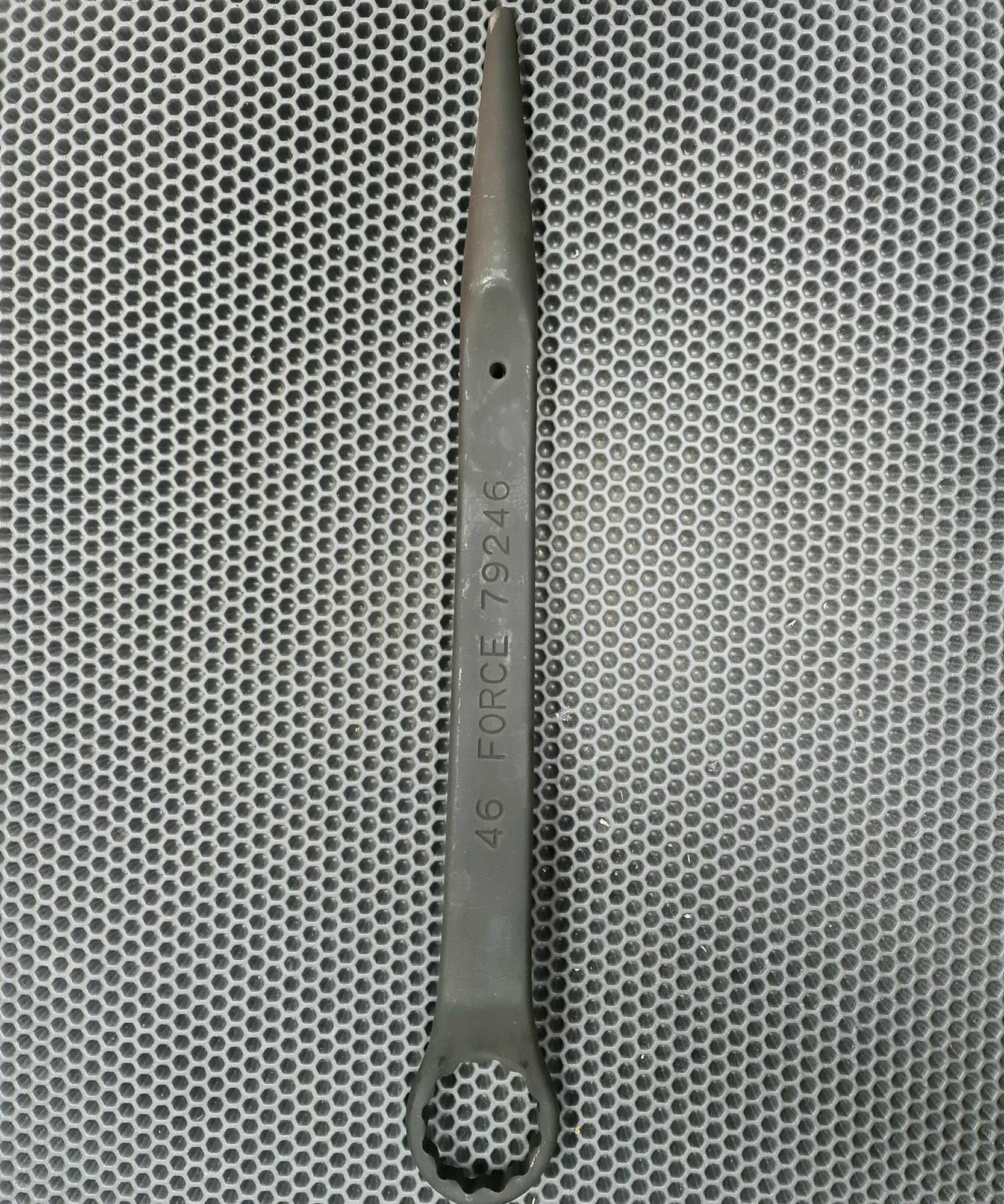 Ключ изготовлен из закаленной хром-ванадиевой стали. Изогнутая под углом 45° рабочая часть ключа дает возможность работы с крепежом, расположенным в углублениях.