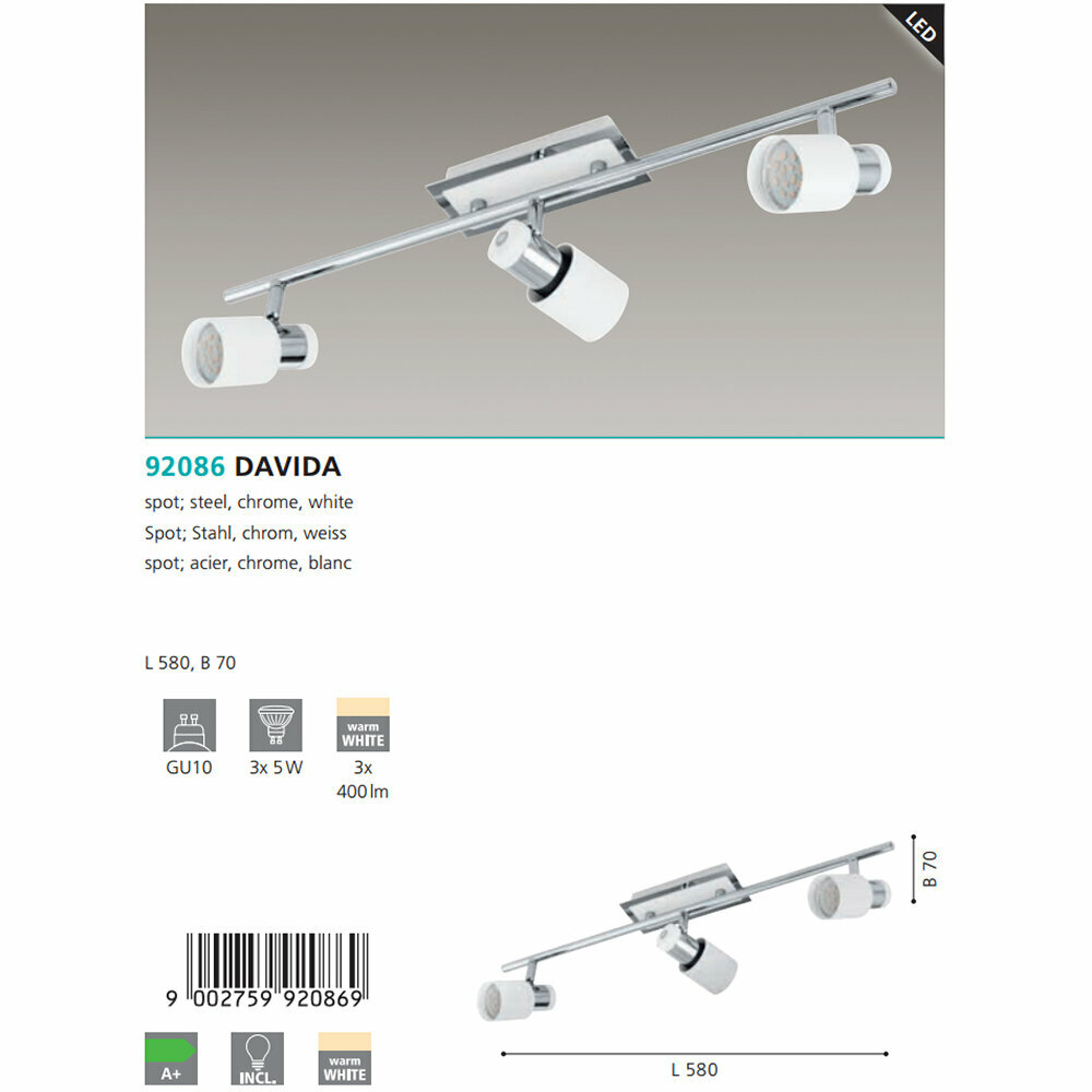Спот на штанге Davida - продукт известной компании Eglo (Австрия). Имеет максимальную мощность 15 Вт, освещает площадь до 1 кв. м. Отлично подойдет для таких мест, как прихожая и коридор, спальня, гостиная, кабинет, офис, кафе. Впишется в интерьеры следующих стилей: современный.